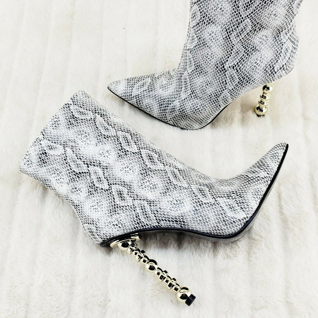5" Geo Deco High Heel White Snake Print Pointy Toe Ankle Boots Shawna