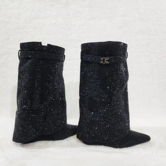 Betty Sparkling Black Rhinestone Skirted Fold Over Calf Boots 4.5" Wedge Heels