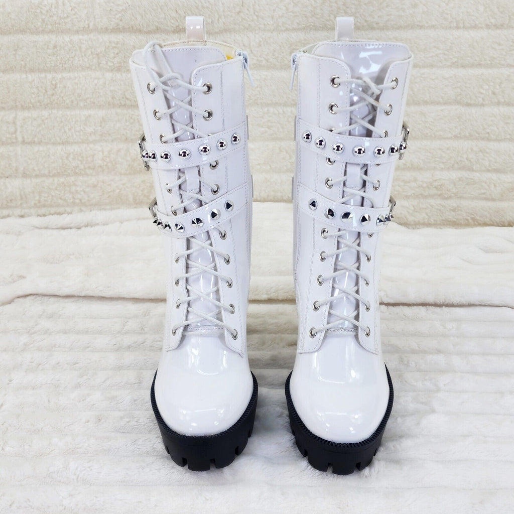 Bright White Patent Lug Sole Studded Strap Ankle Boots Temptress