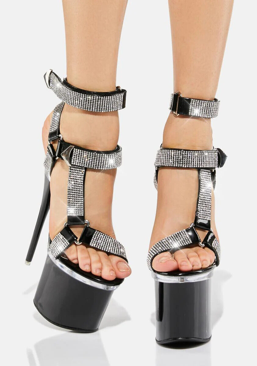 Bulls Black Slim Stiletto 8" Heel Rhinestone Harness Strap Platform Shoes