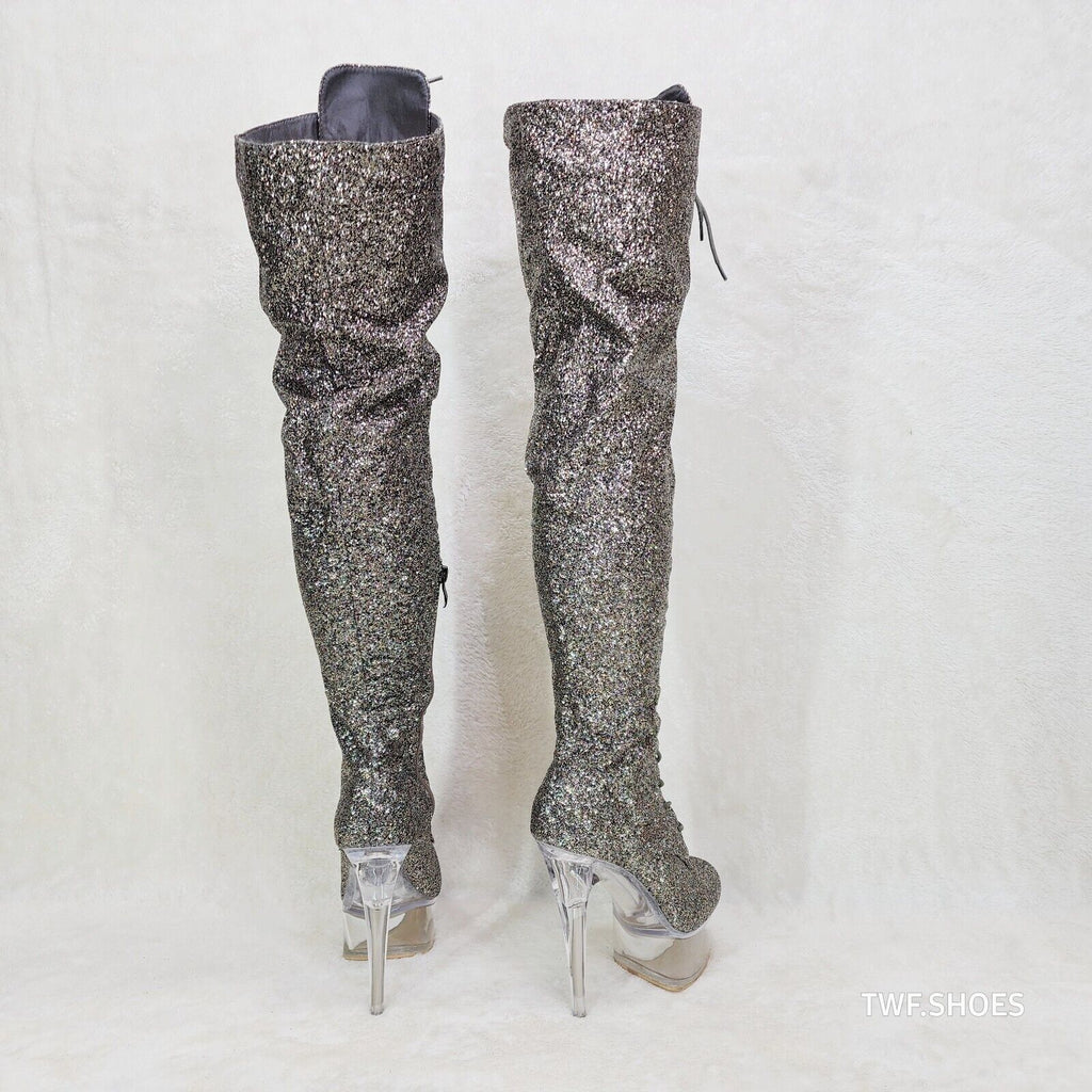 Bulls Silver Glitter Over the Knee Clear Platform High Heel Thigh Boot