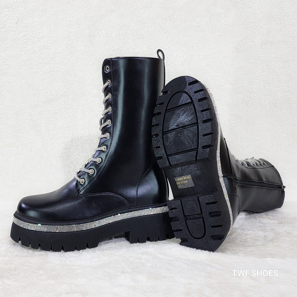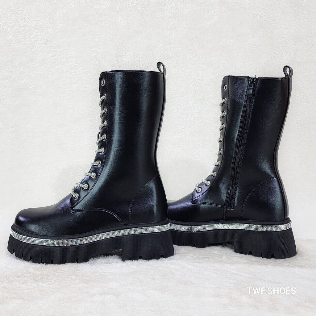 Combat Sparkle Mid Calf Rhinstone Platform & Laces Biker Glam Boots Black Vegan