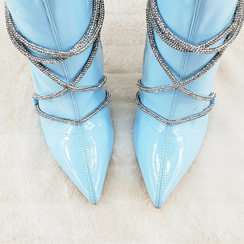 Destiny Baby Blue Stretch Patent Cable Rhinestone Strap High Heel Ankle Boots