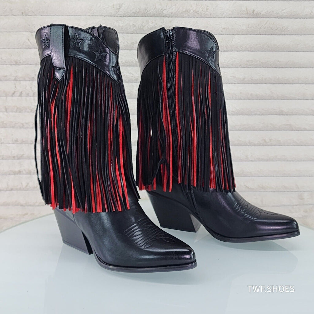 Dusty Roads Mid Calf Black and Red Fringe Country Western Cowgirl Boots