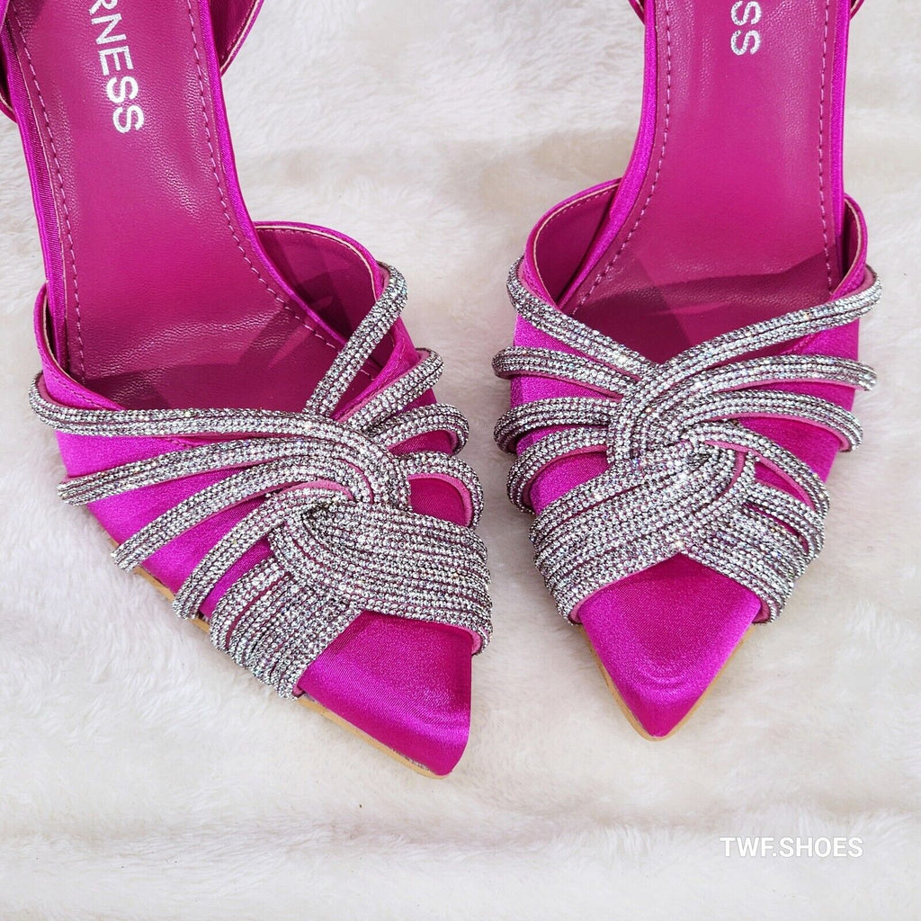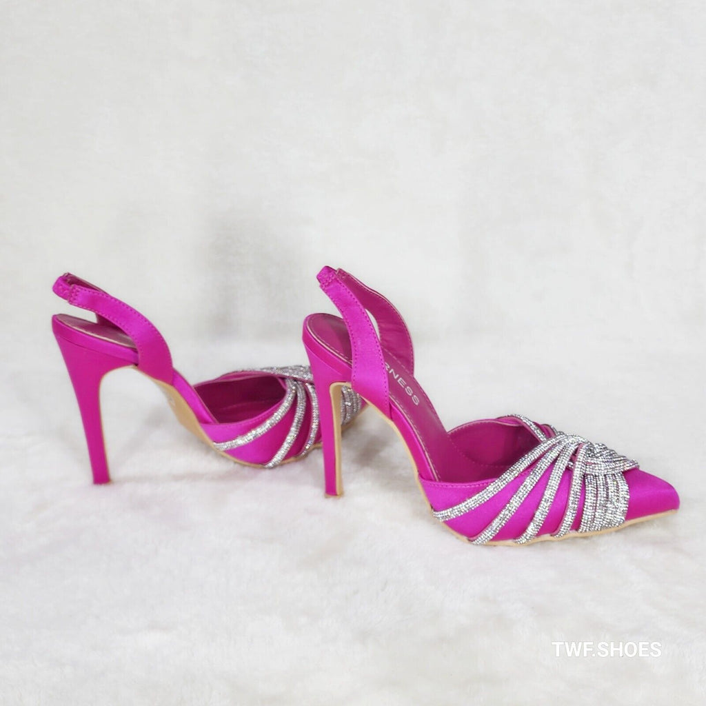 Elegance Slip on Slingback Fuchsia Satin Rhinestone Pointy Toe High Heels Shoes