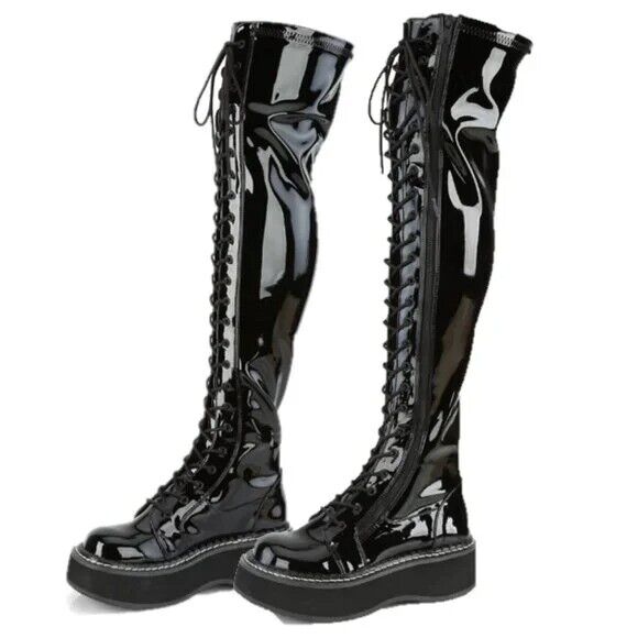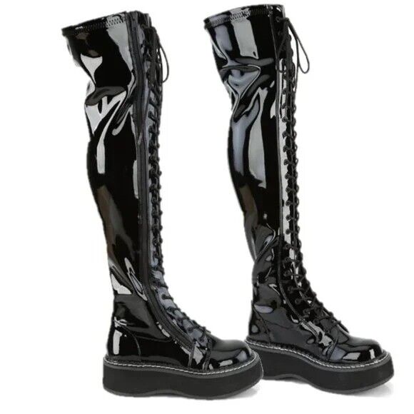 Emily 375Black Patent Lace Up 2" Platform Goth Punk OTK Thigh Boots DEMONIA