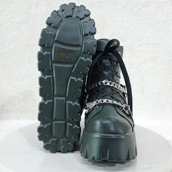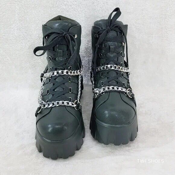Emo Stomp 2" Platform Stomper Ankle Boots With Chain Design Faux Leather Green