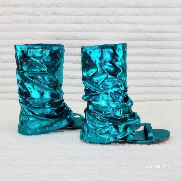 Fabulous Metallic Green Mermaid Upper & Rhinestones Sandal Slouch Boots Shooties