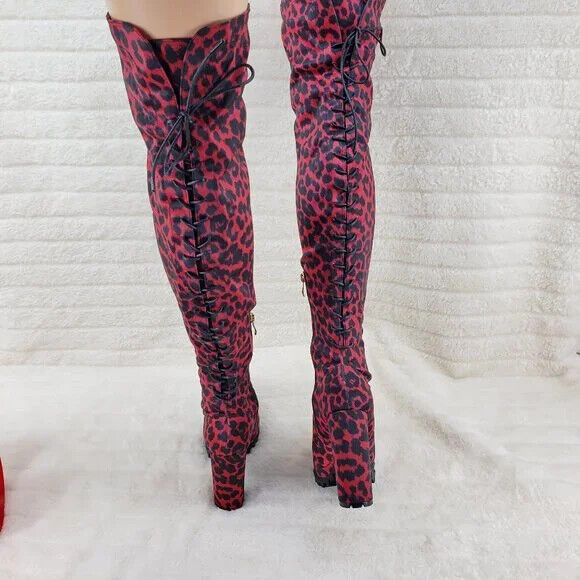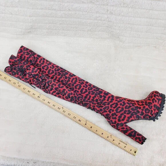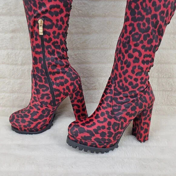 Fever Red Leopard Stretch Lace Up Back OTK Chunky Heel Boots Lug Sole