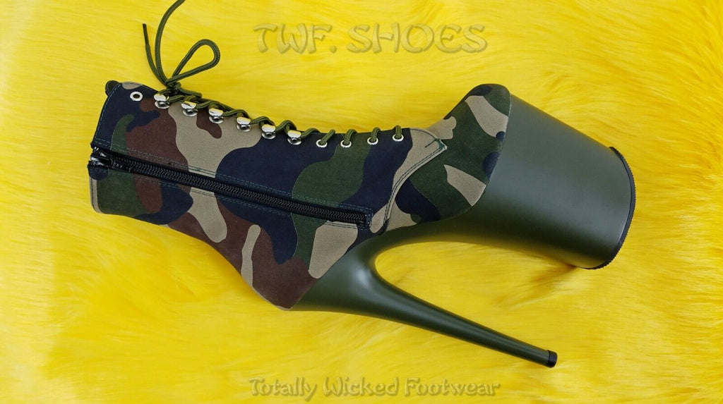 Flamingo 1020 Green Camo Olive Platform 8" High Heel Lace Up Ankle Boots 7-12 NY