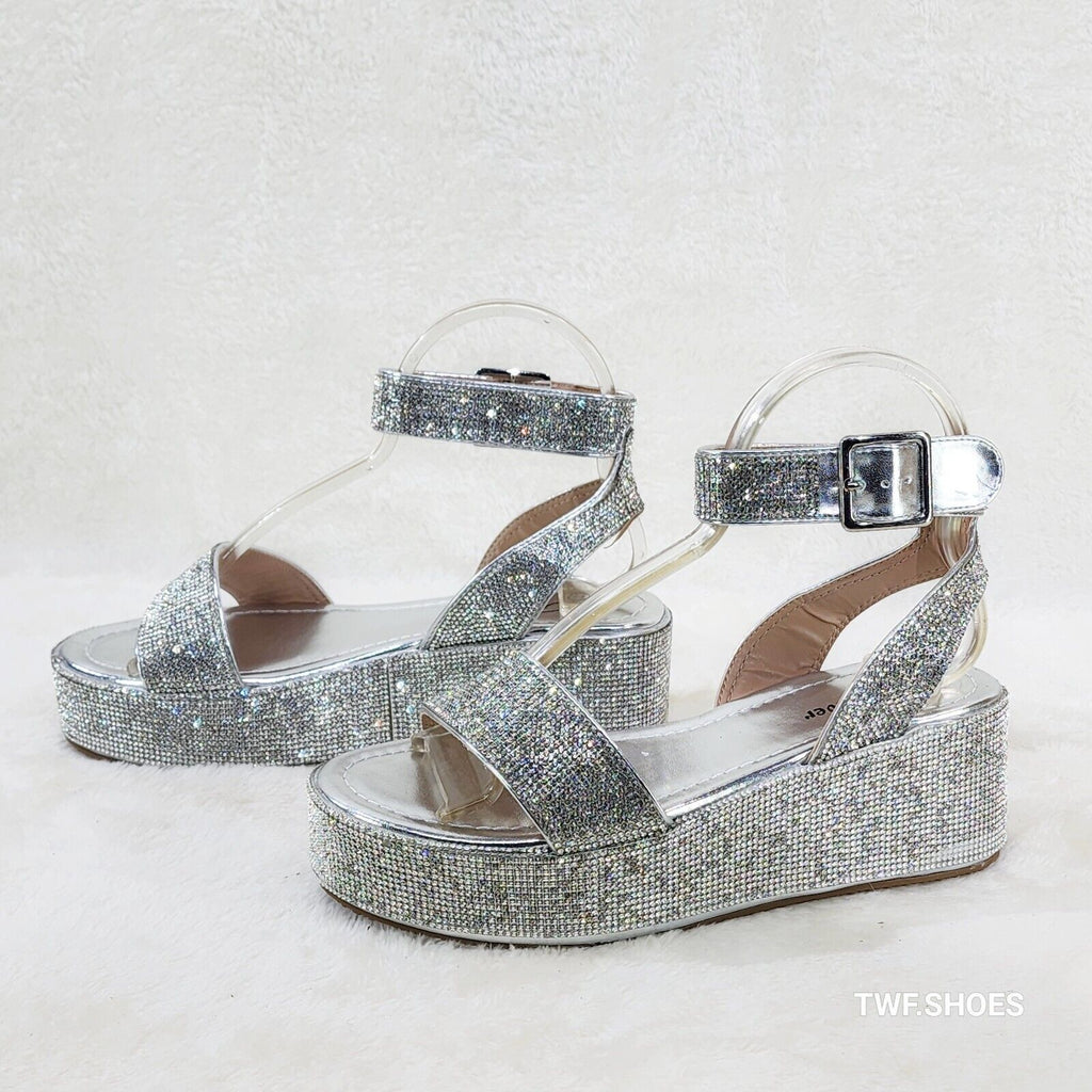 Flashy Silver Ankle Strap Sparkling Rhinestone Wedge 2" Platform Sandals