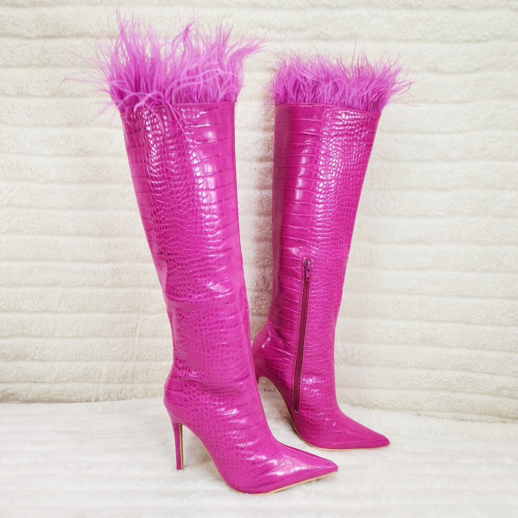 Flirty Fuchsia Pink Snake Texture Knee High Heel Stiletto Boots Sexy Feather Top
