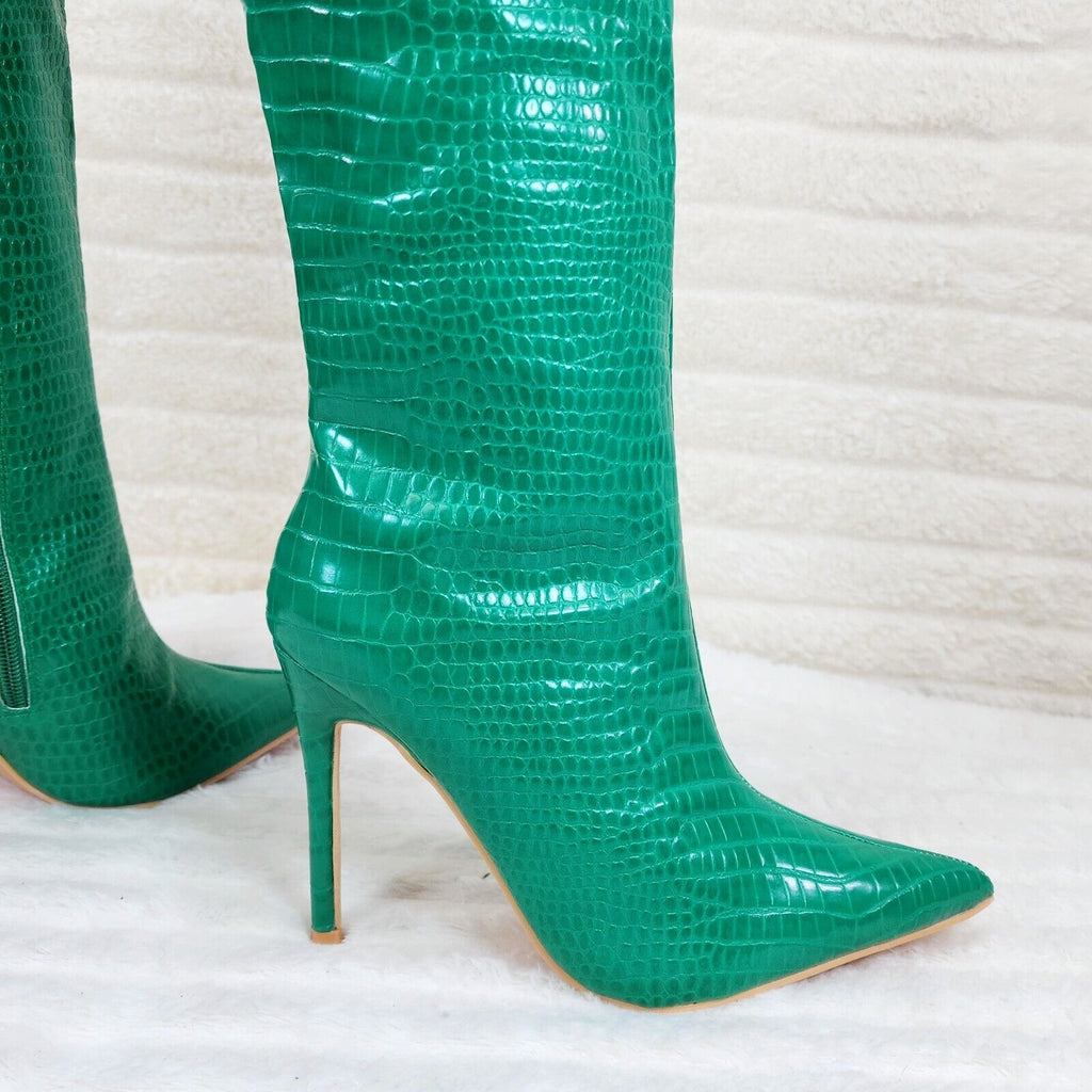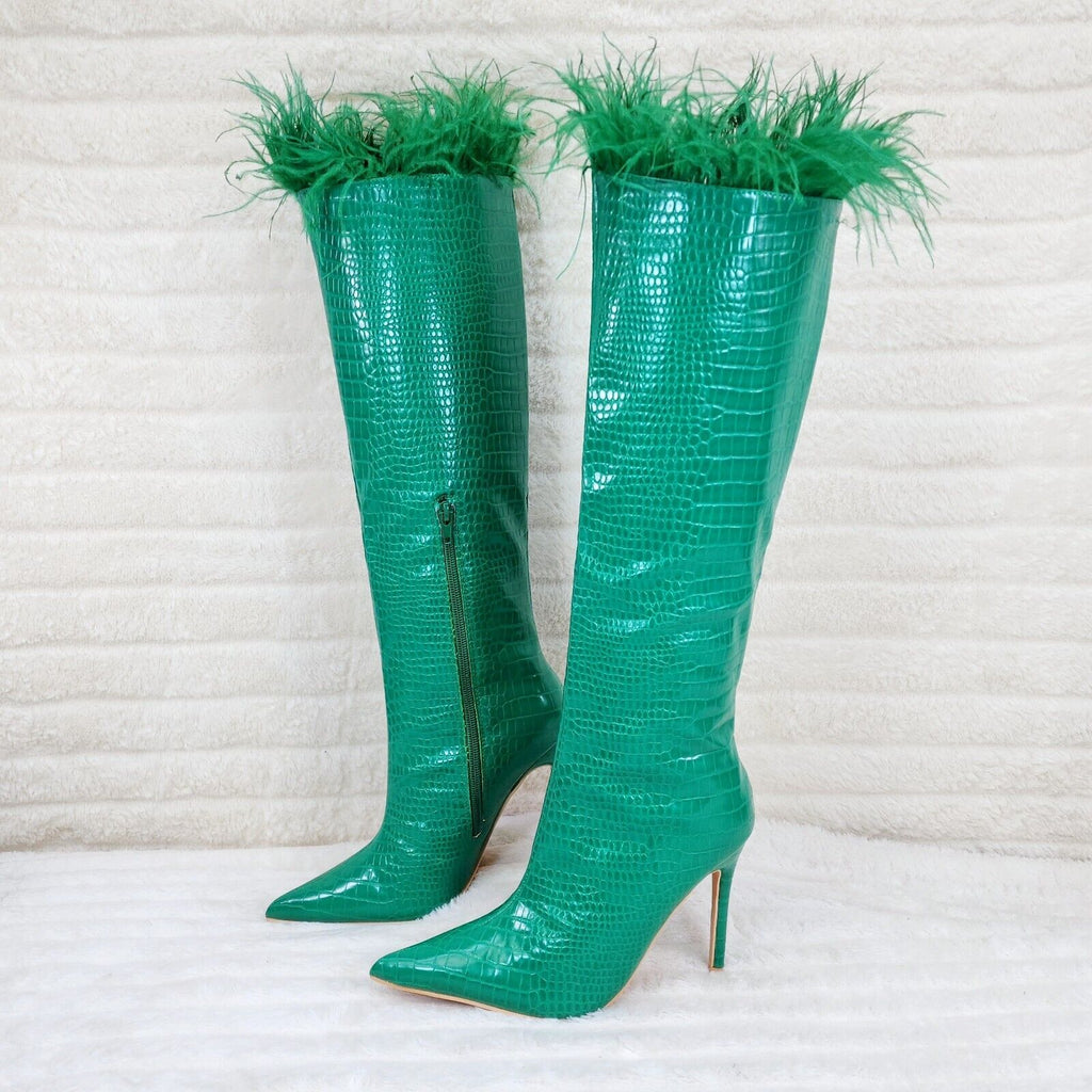 Flirty Green Snake Texture Knee High Heel Stiletto Boots Sexy Feather Top