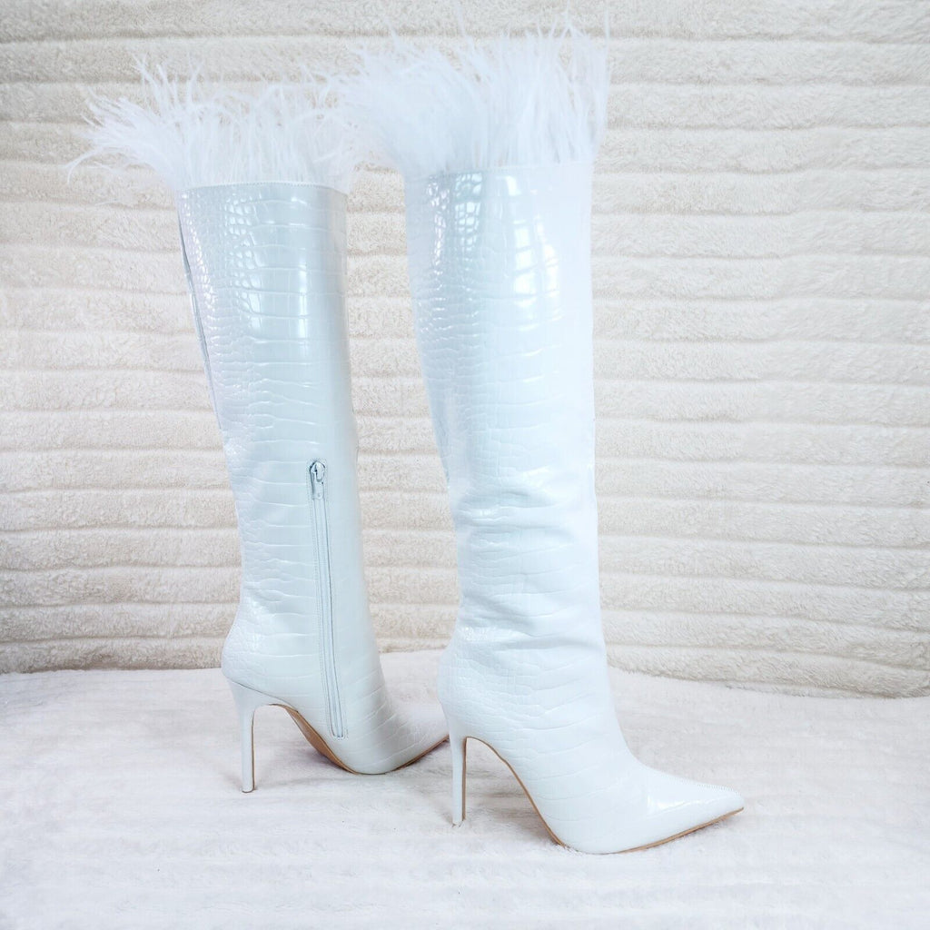 Flirty White Snake Texture Knee High Heel Stiletto Boots Sexy Feather Top