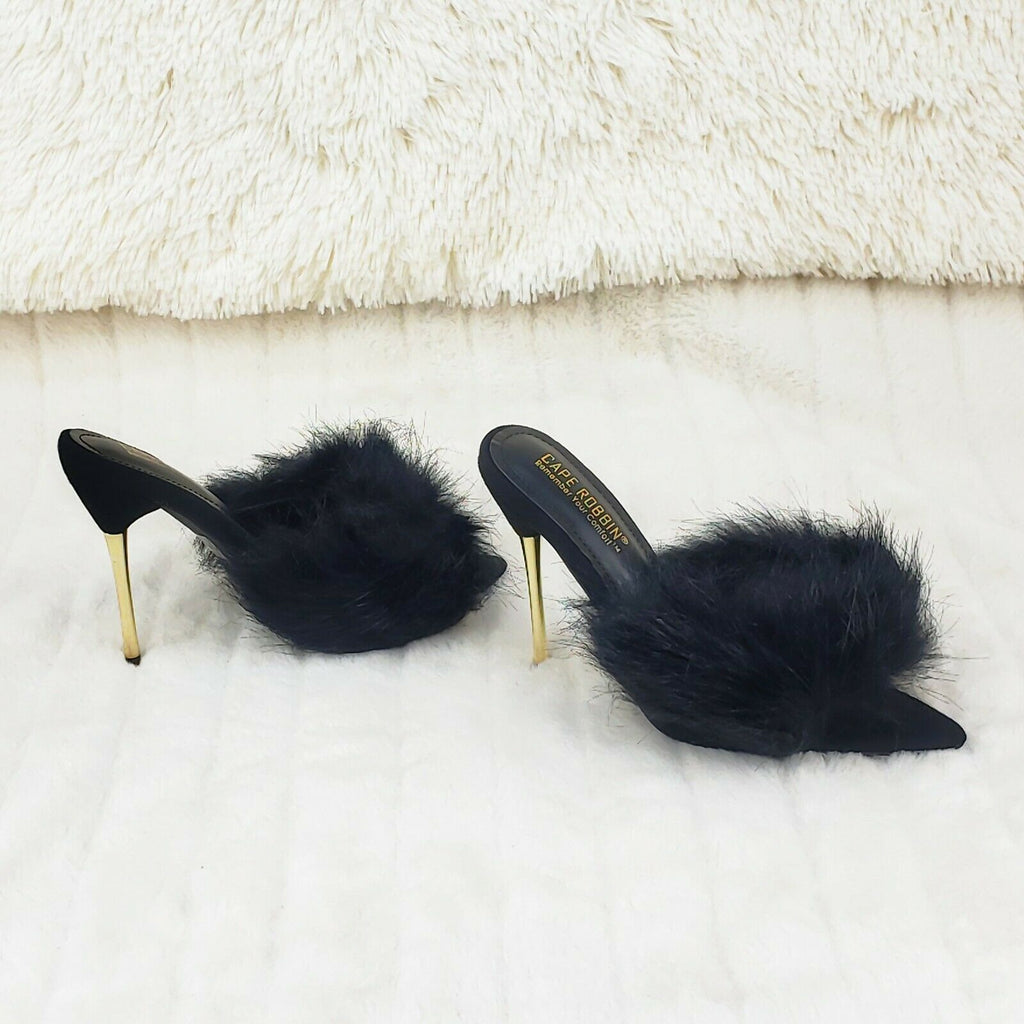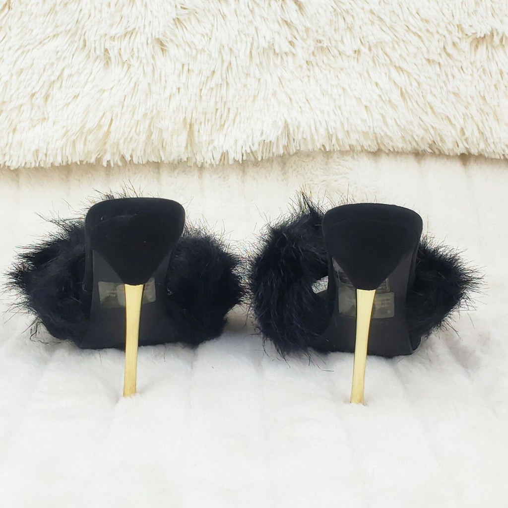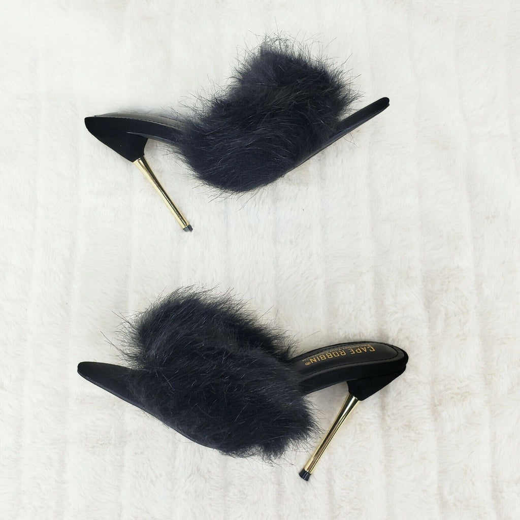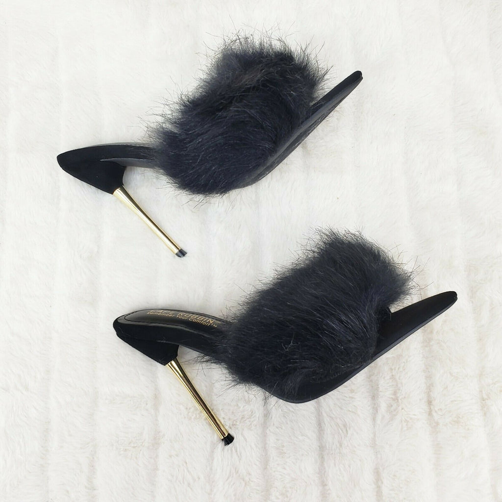 Fuji Furry Pointy Toe Slip On 4.5" Gold Tone Slim Heels Black