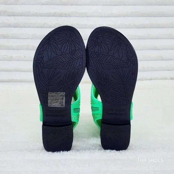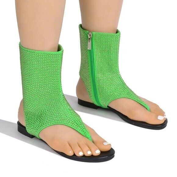 Just Doit Rhinestones Flat Bootie Thong Sandals Green
