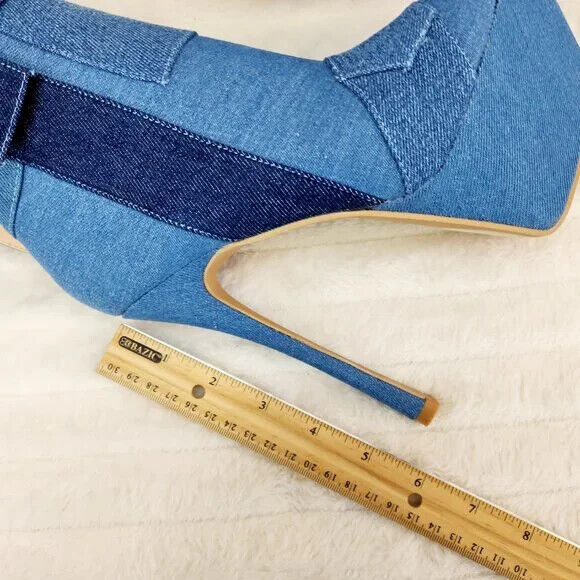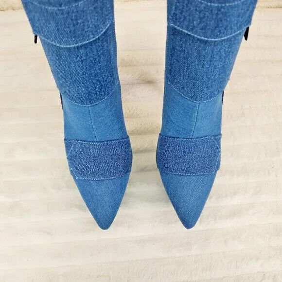 Kinder Pointy Toe Platform Stiletto Heel Ankle Boots Denim Patchwork