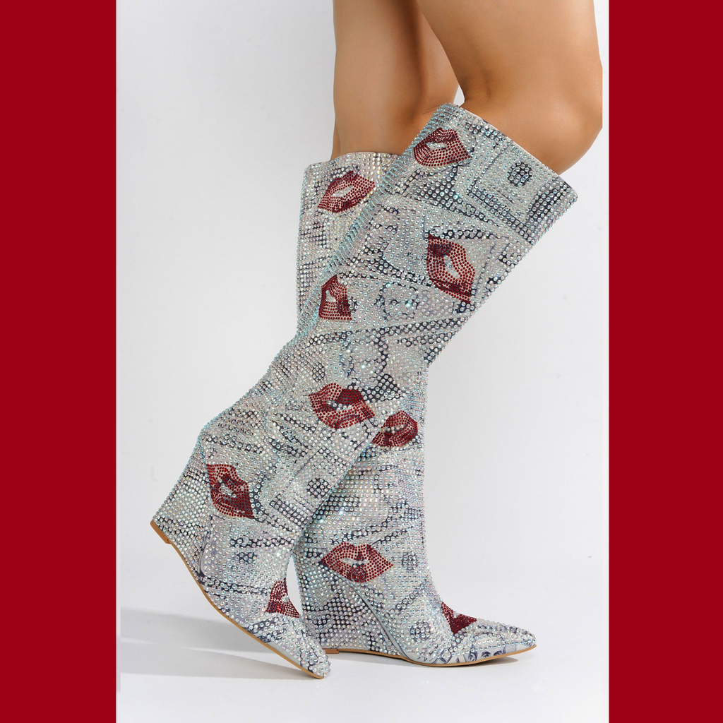 Kisses Silver Rhinestone Kiss Print Wedge Heel Knee Boots NEW