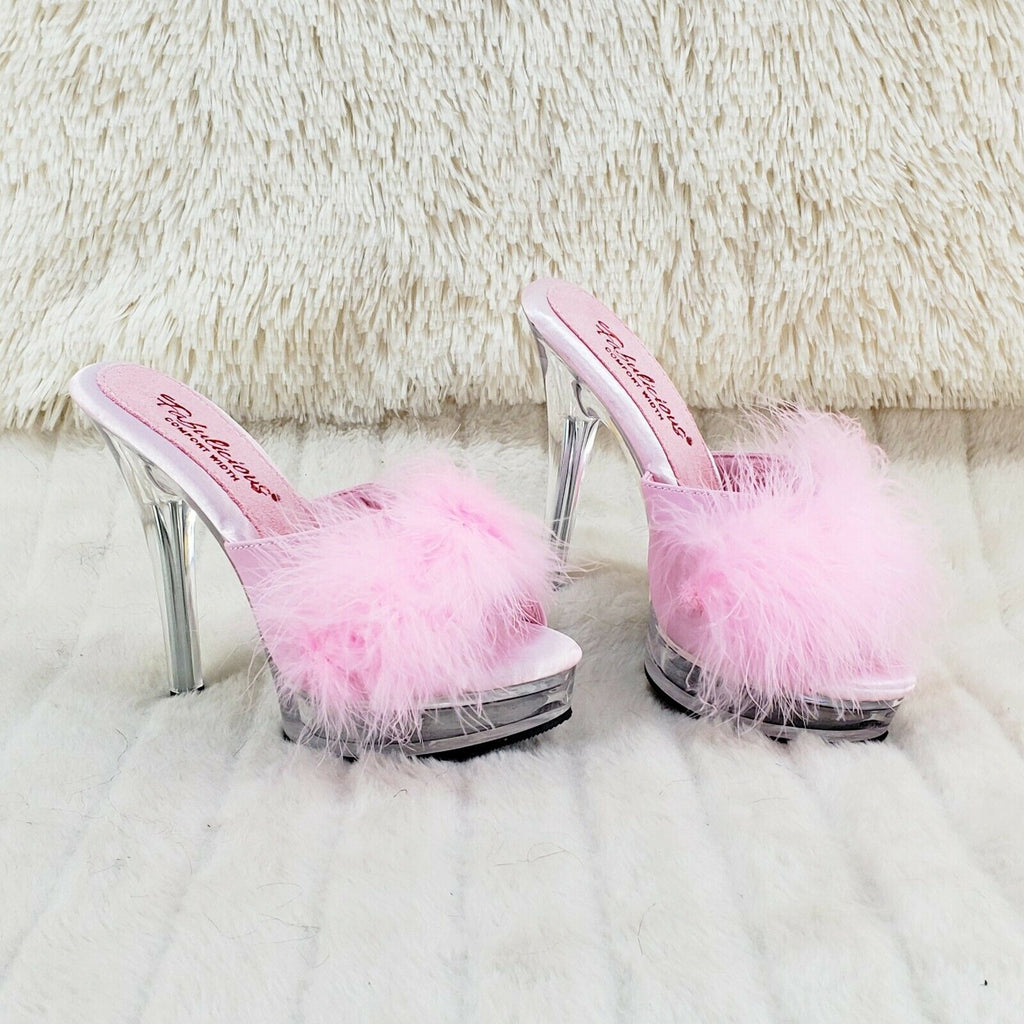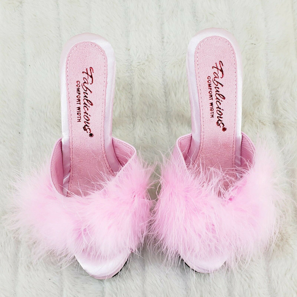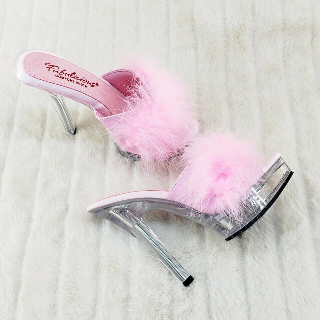 Majesty 501 Marabou Feather Slip On Platform Sandals 6" Stiletto Heel Shoes Pink