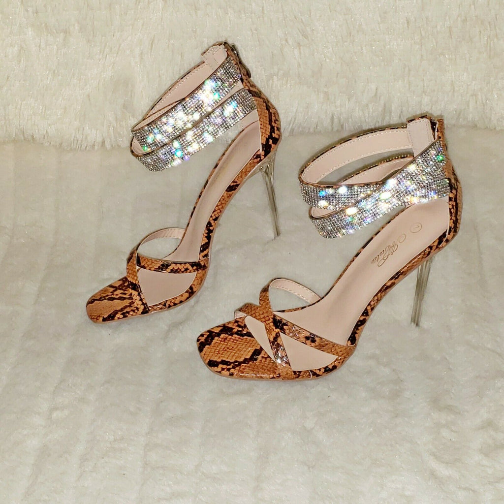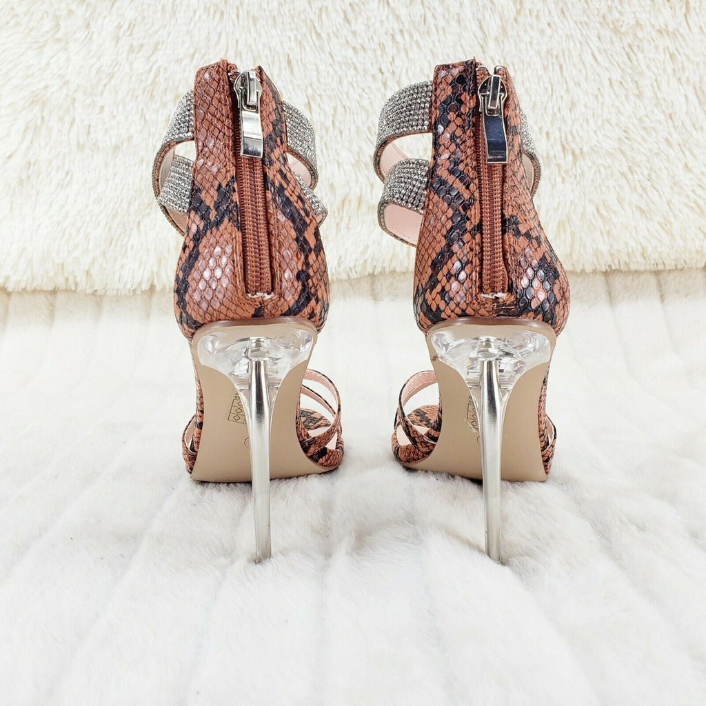 Mata Brown Snake Print Rhinestone Double Ankle Strap Closed Back High Heel Shoes