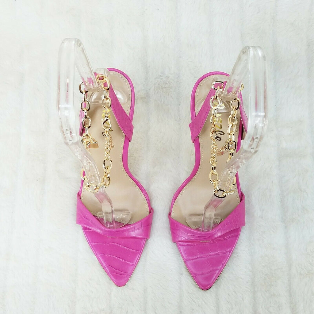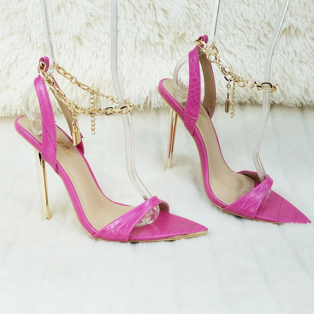 Nicely Pad Lock Chain Strap High Heels Metal Toe Tip Shoes Fuchsia Pink
