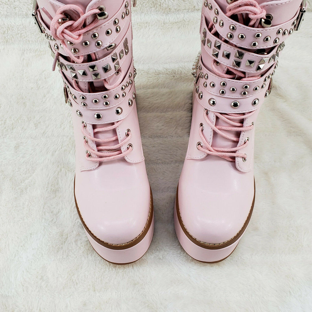 Ocho Baby Pink Ice Multipile Stud Strap Platform Chunky Block Heel Ankle Boots