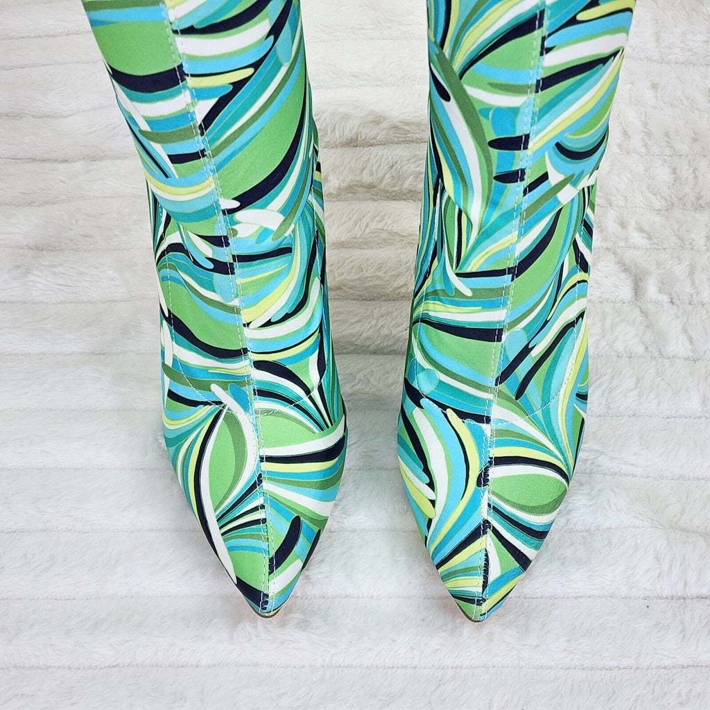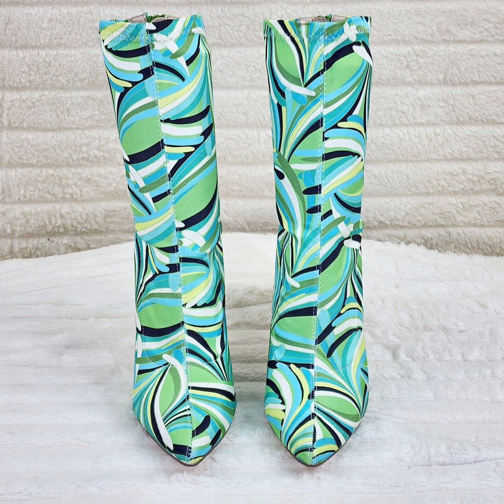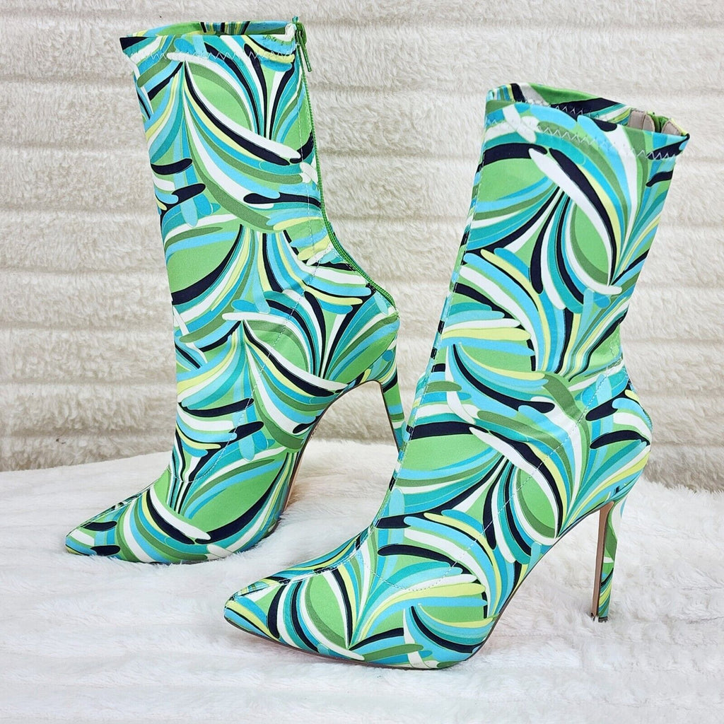 Odin Crazy Wild Color Pattern High Heel Stretch Fabric Ankle Boots - Green Blue