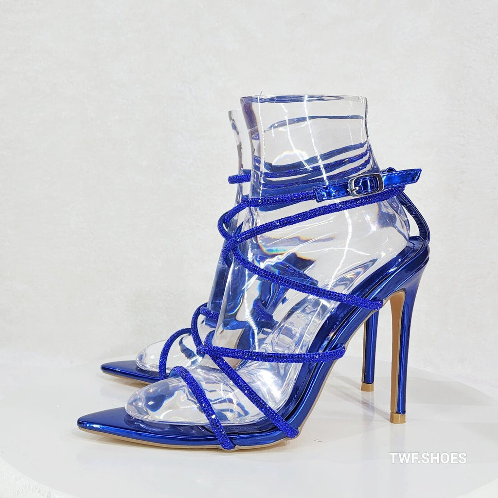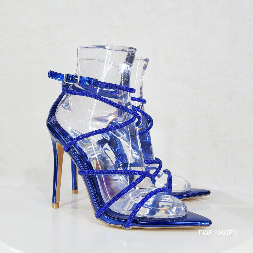 Party Town Blue Metallic Strappy Rhinestone Pointy Toe High Heels