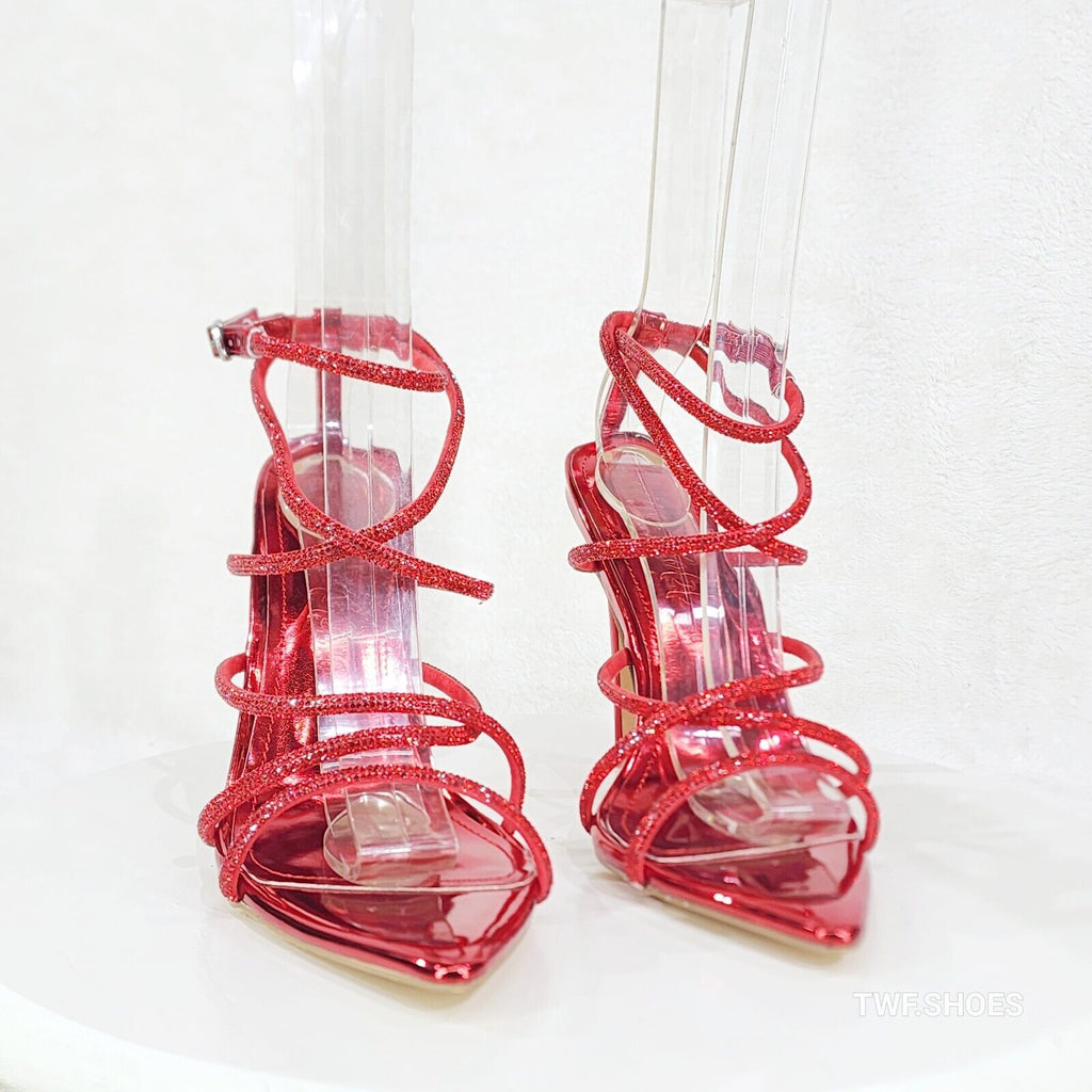 Party Town Red Metallic Strappy Rhinestone Pointy Toe High Heels