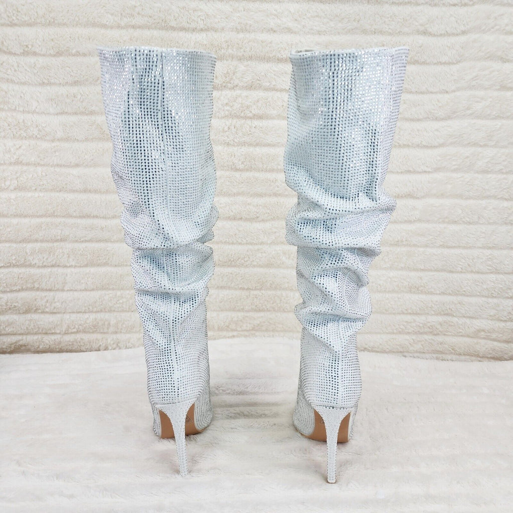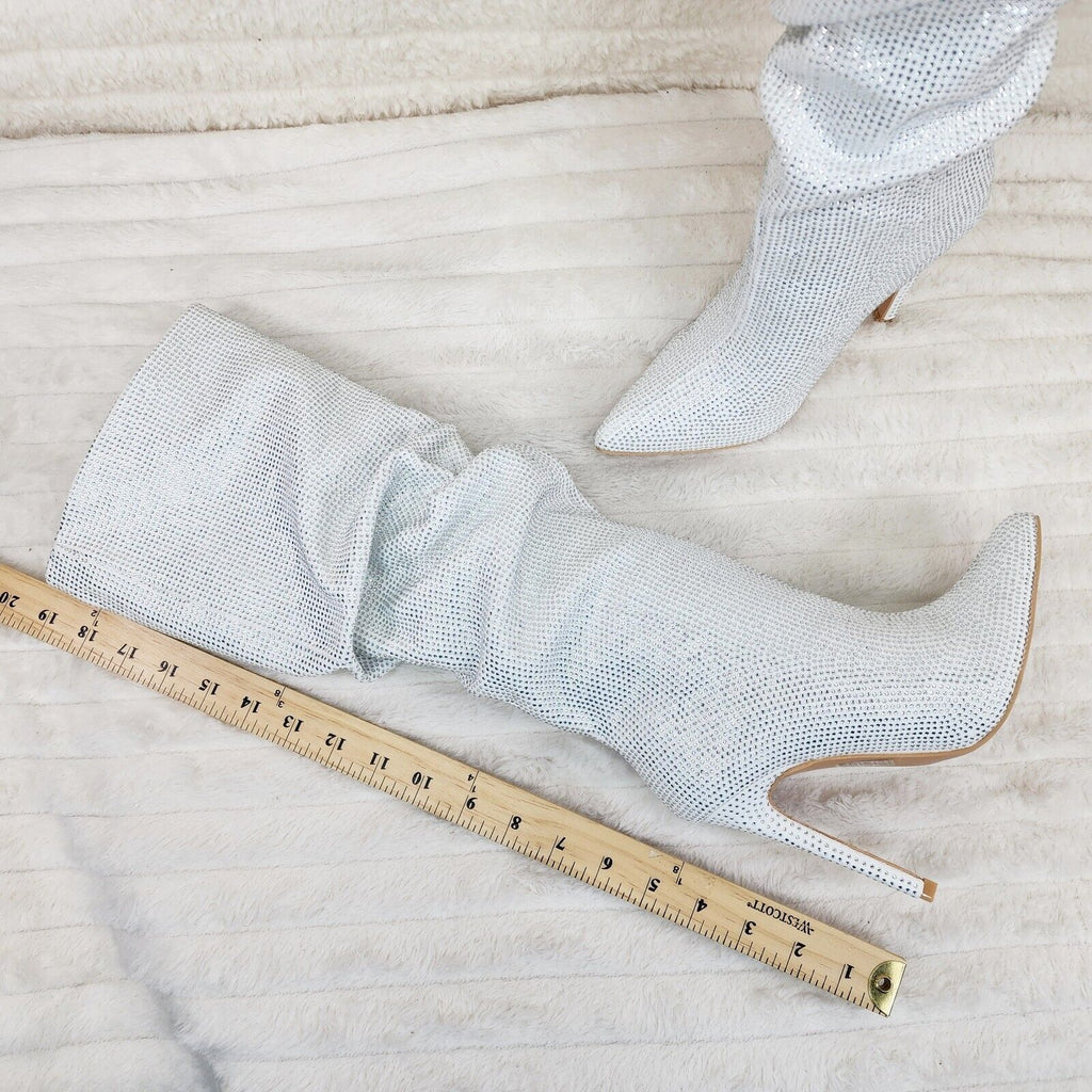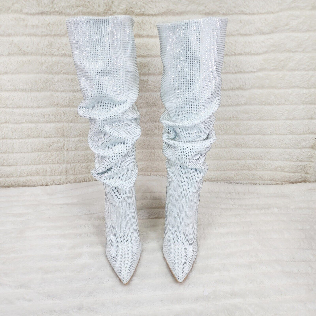 Radiant White Rhinestone High Heel Stiletto Slouch Knee High Boots