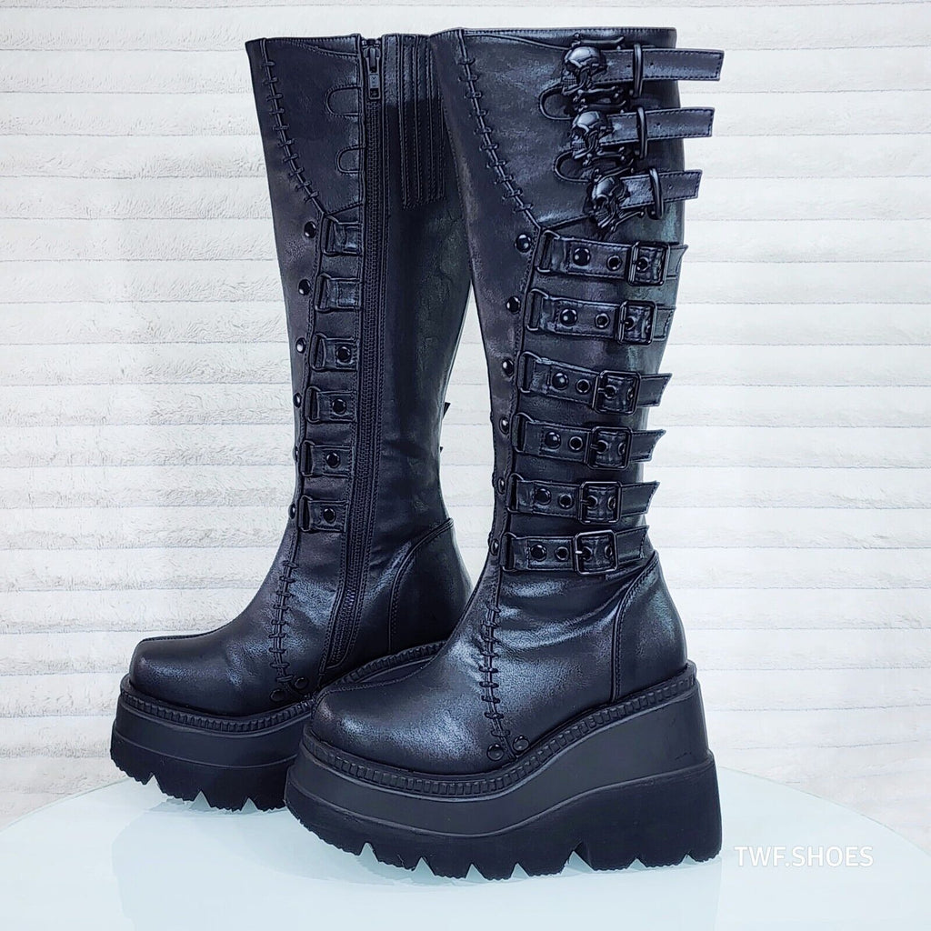 Shaker Black Matte Platform 4.5" Wedge Heel Skull Buckle Knee Boots NY DEMONIA