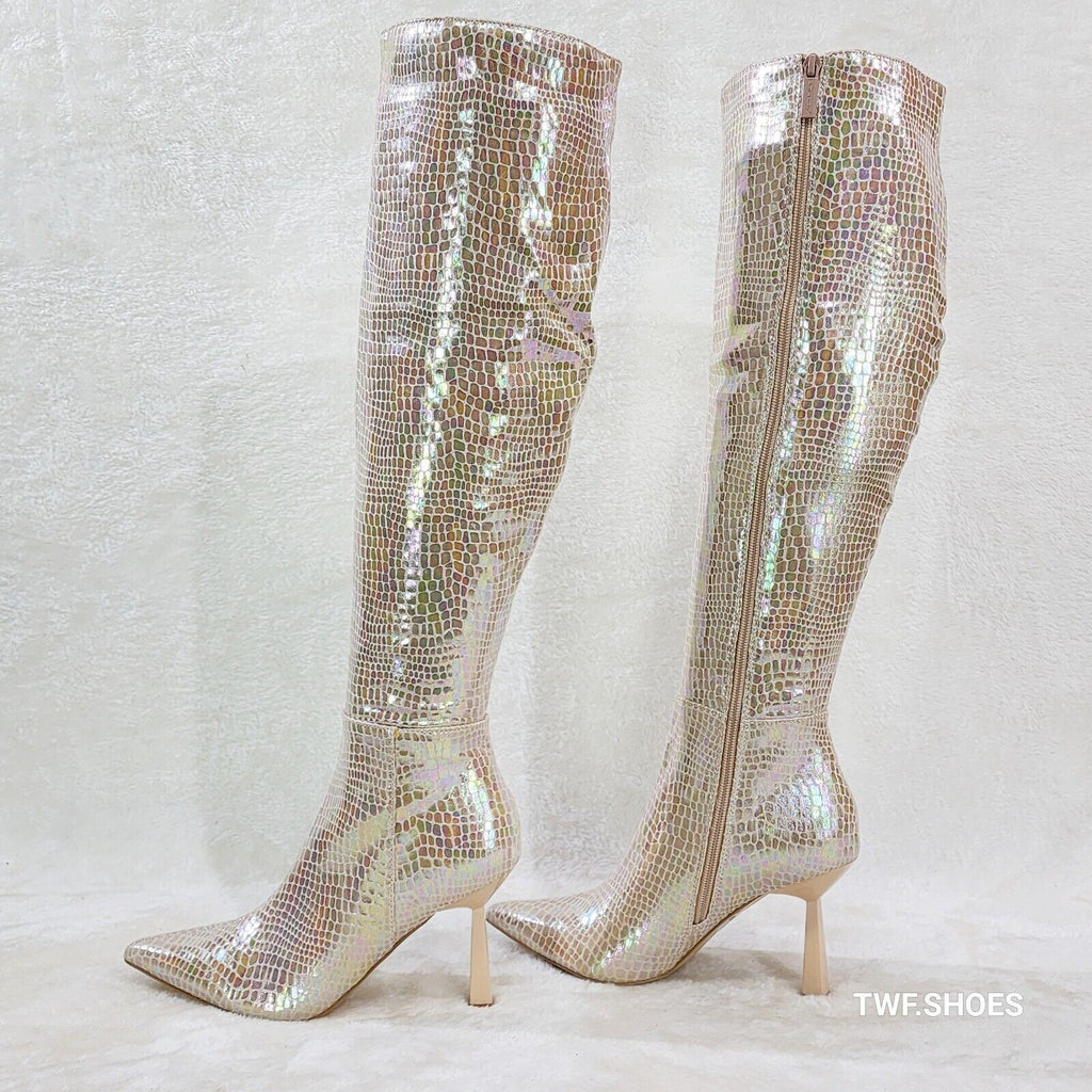 Sharp Champagne Cream Hologram Snake Print High Heel Knee Boots