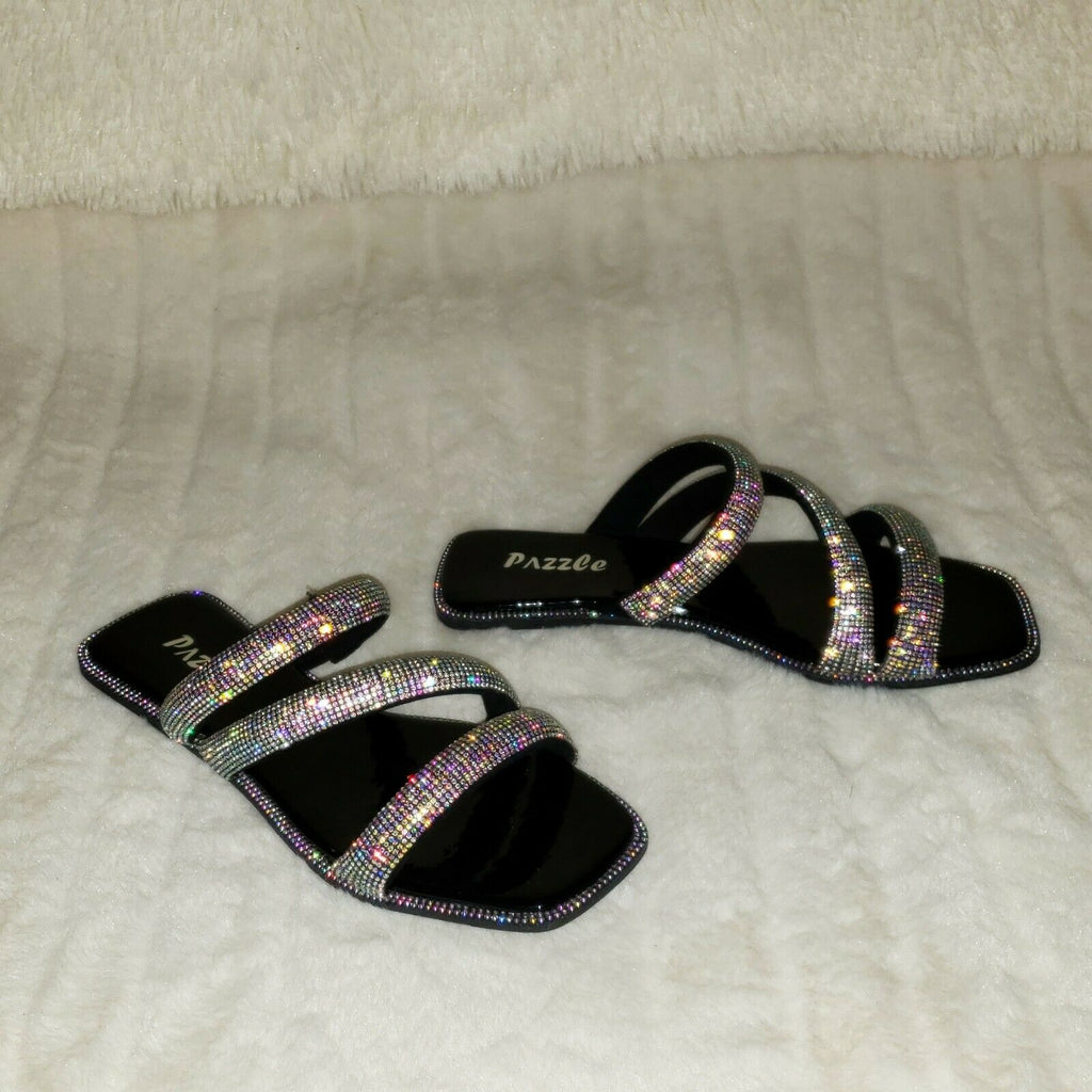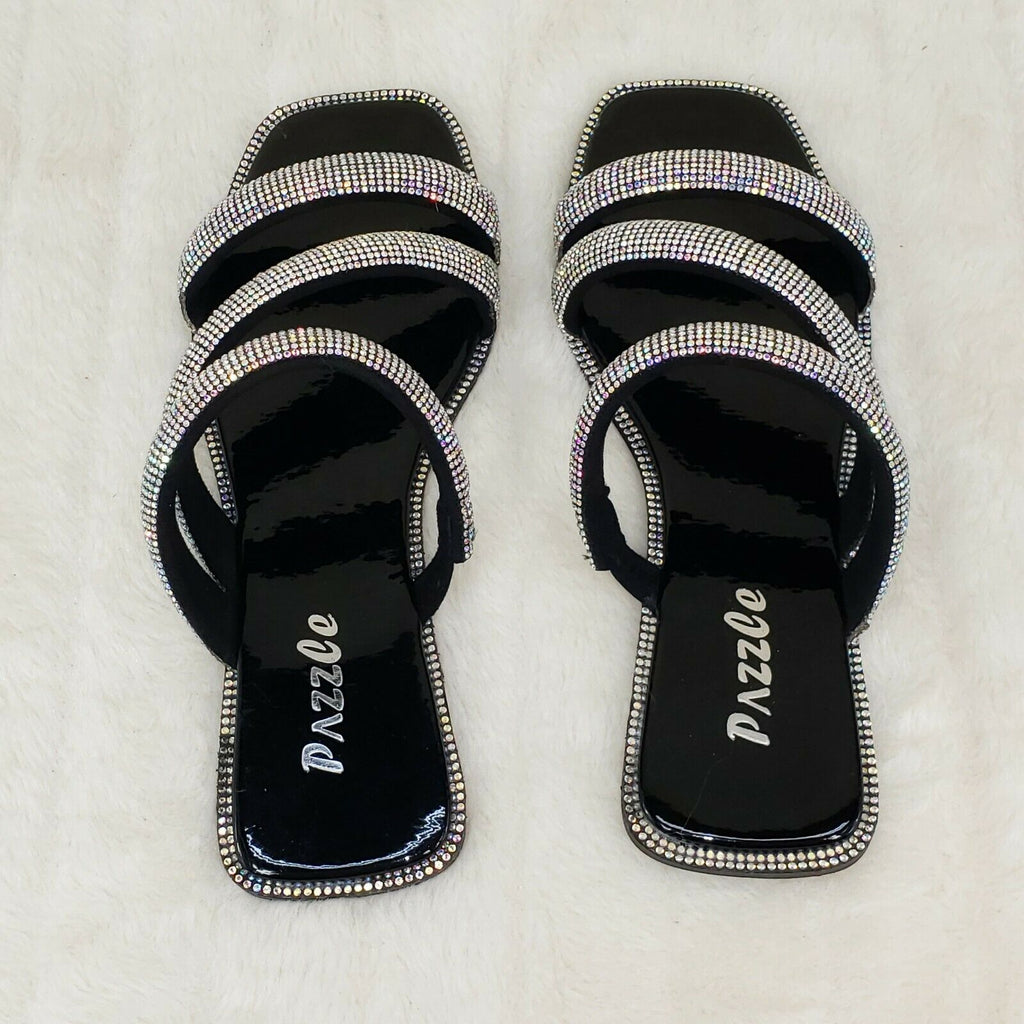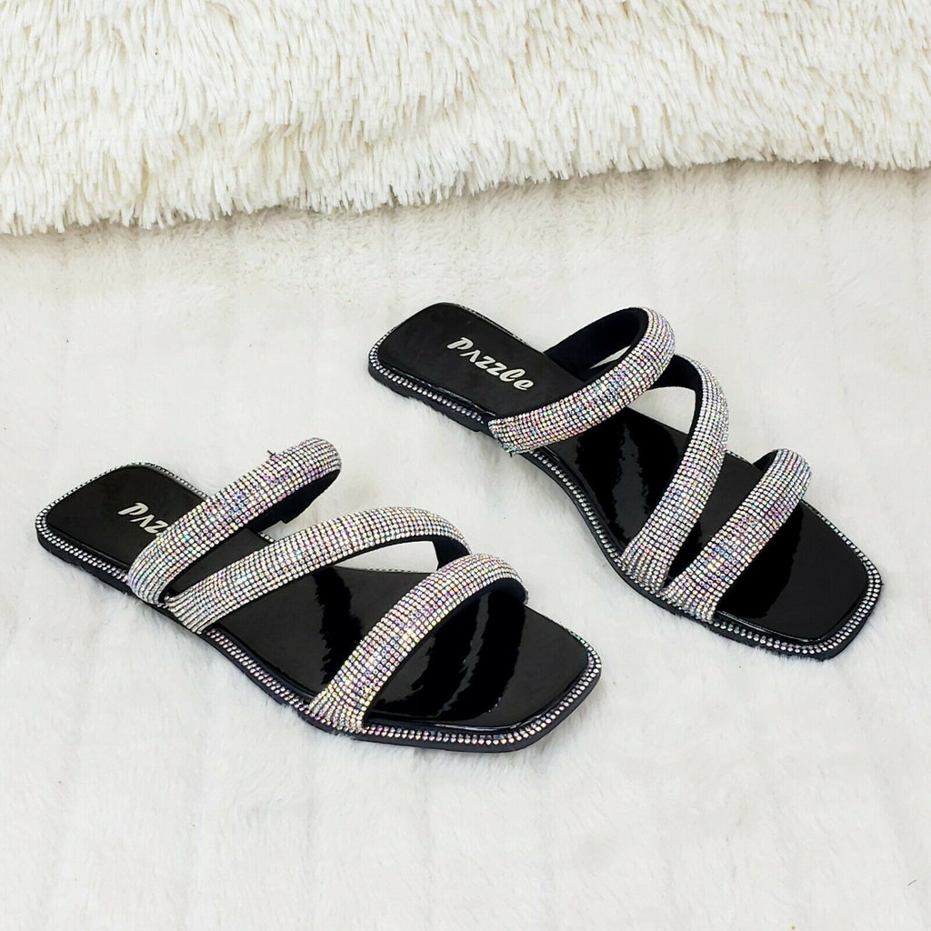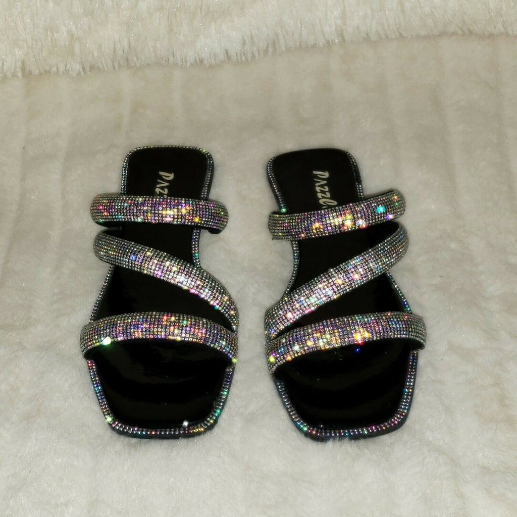 Sparkle Triple Padded Strap Slip On Iridescent Rhinestone Sandals Black