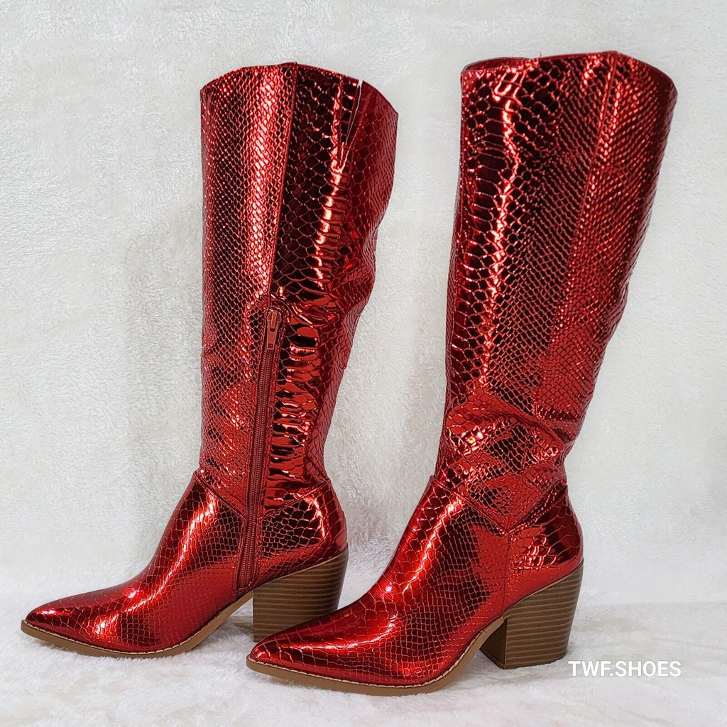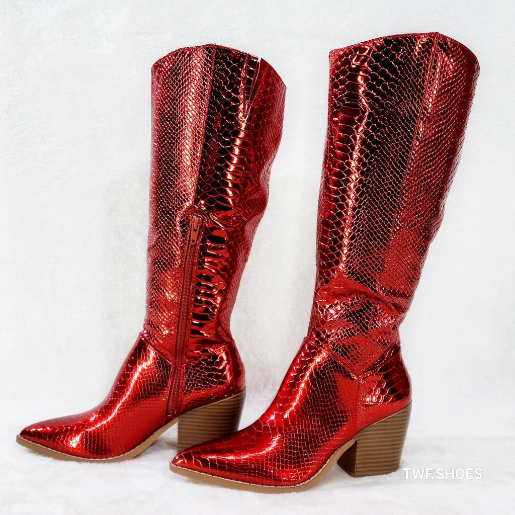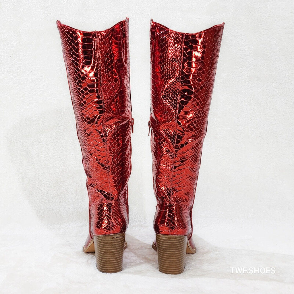 Static Cowboy Gloss Metallic Snake Knee High Western Cowgirl Boots Red
