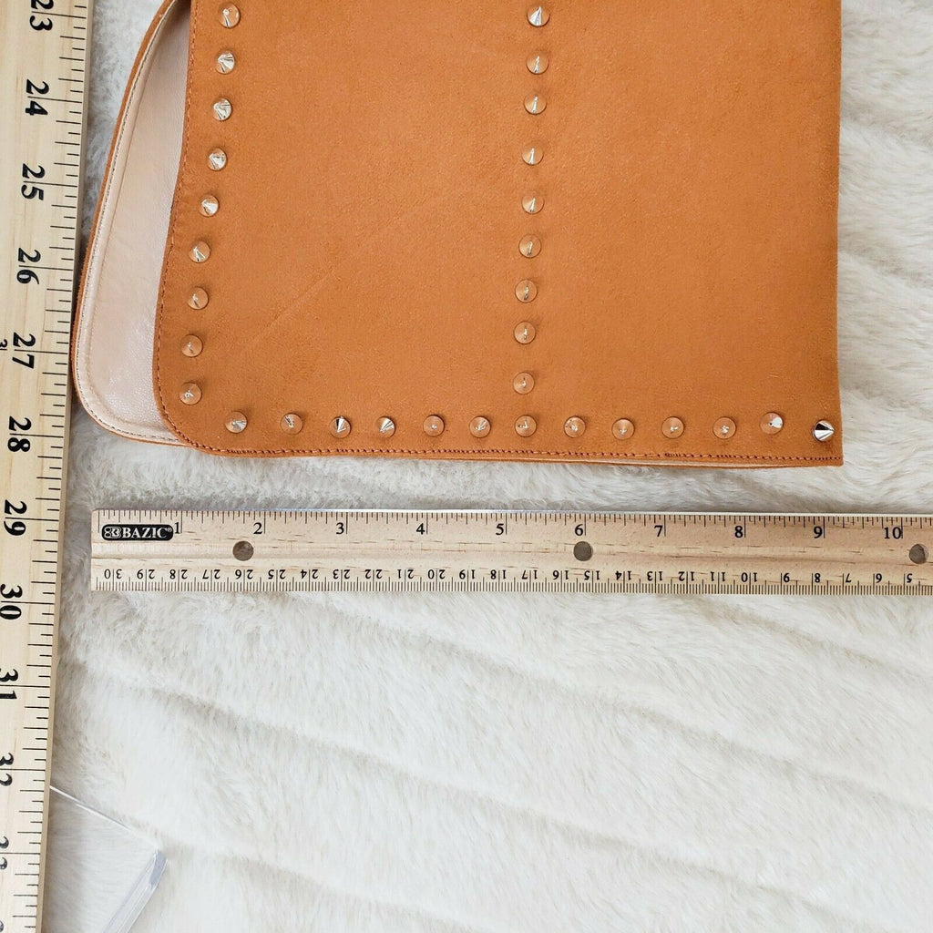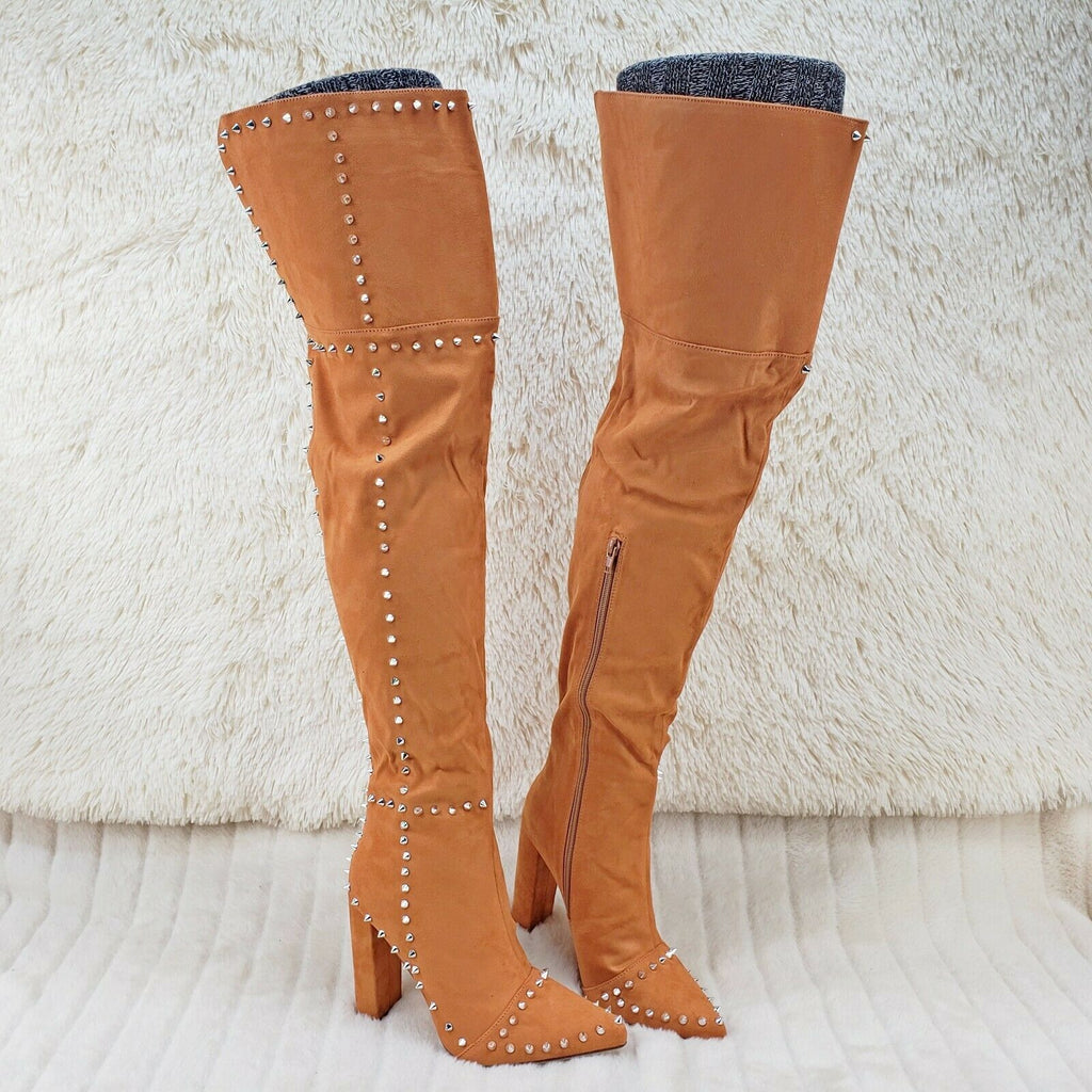 Steph Tan Camel Faux Suede Silver Tone Studded Thigh High Chunky Heel Boots