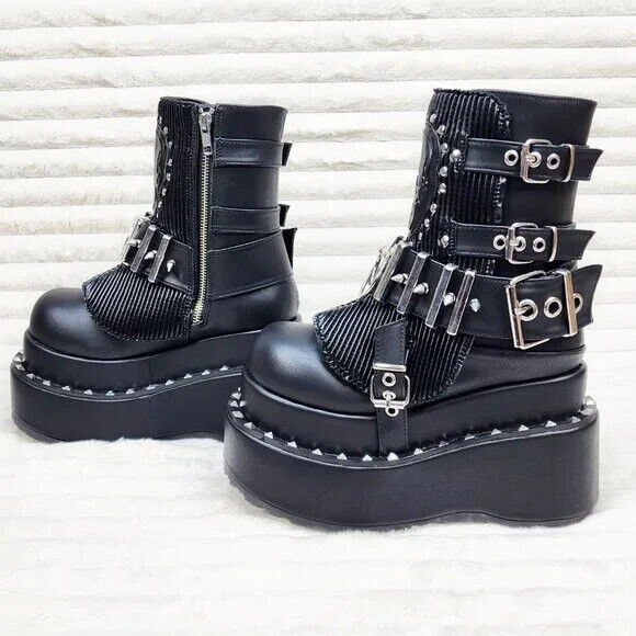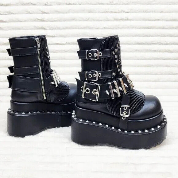 Brand New 4 1/2" (114mm) Tiered Pyramid Stud Trimmed Platform Lace-Up Ankle Boots Adjustable Quilted Shield w/ Stud & Skull Patch Details & Spike Stud Metal Bar & O-ring Center Strap, Side Zip Closure