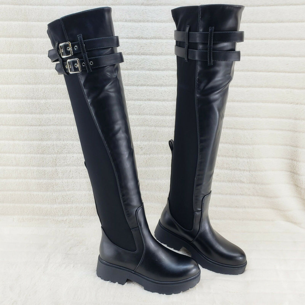 Techno Baby Black Leatherette Spandex Stretch Panel Lug Sole Thigh High Boots