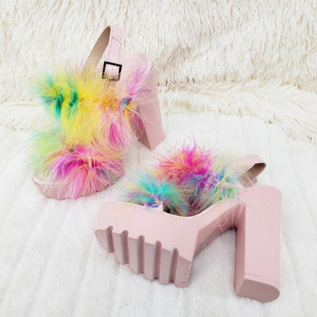 Top Rate Marabou Double Strap Chunky High Heels Platform Sandal Shoes Multicolor