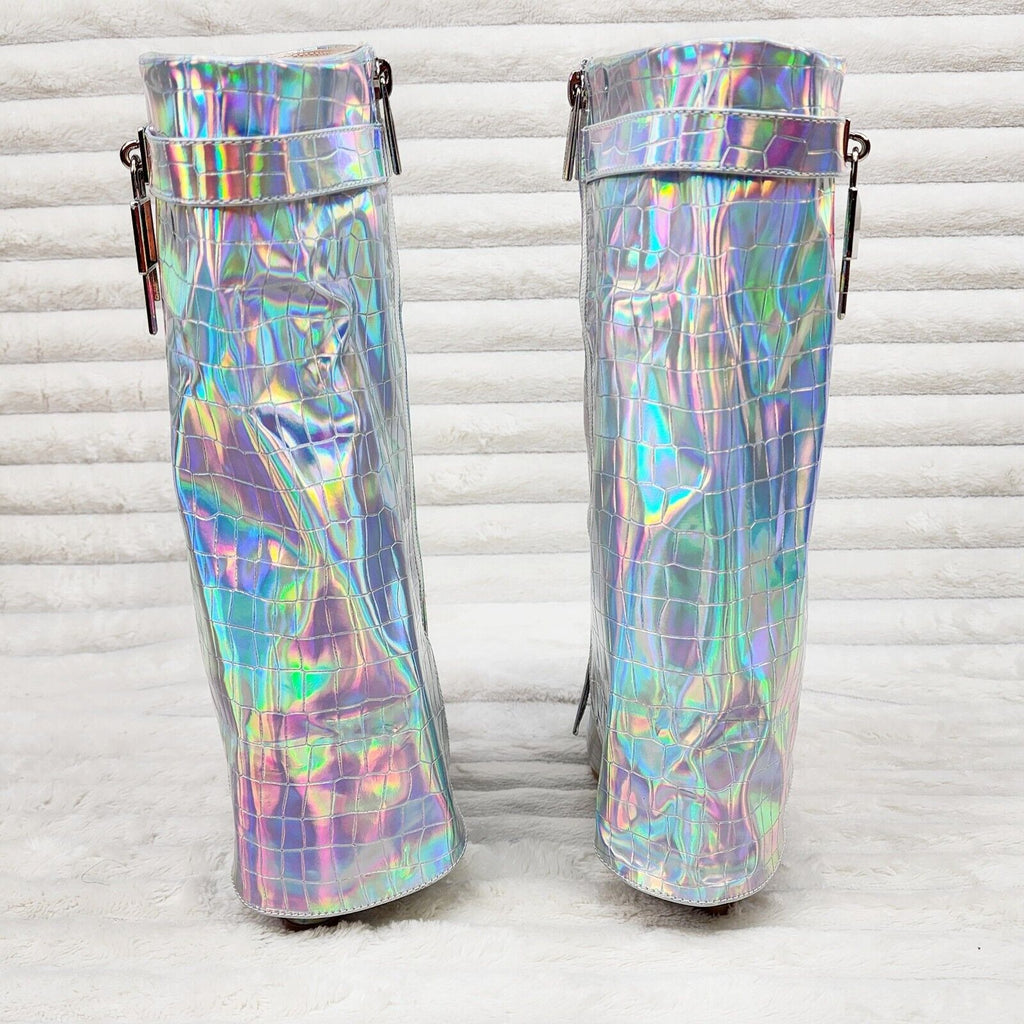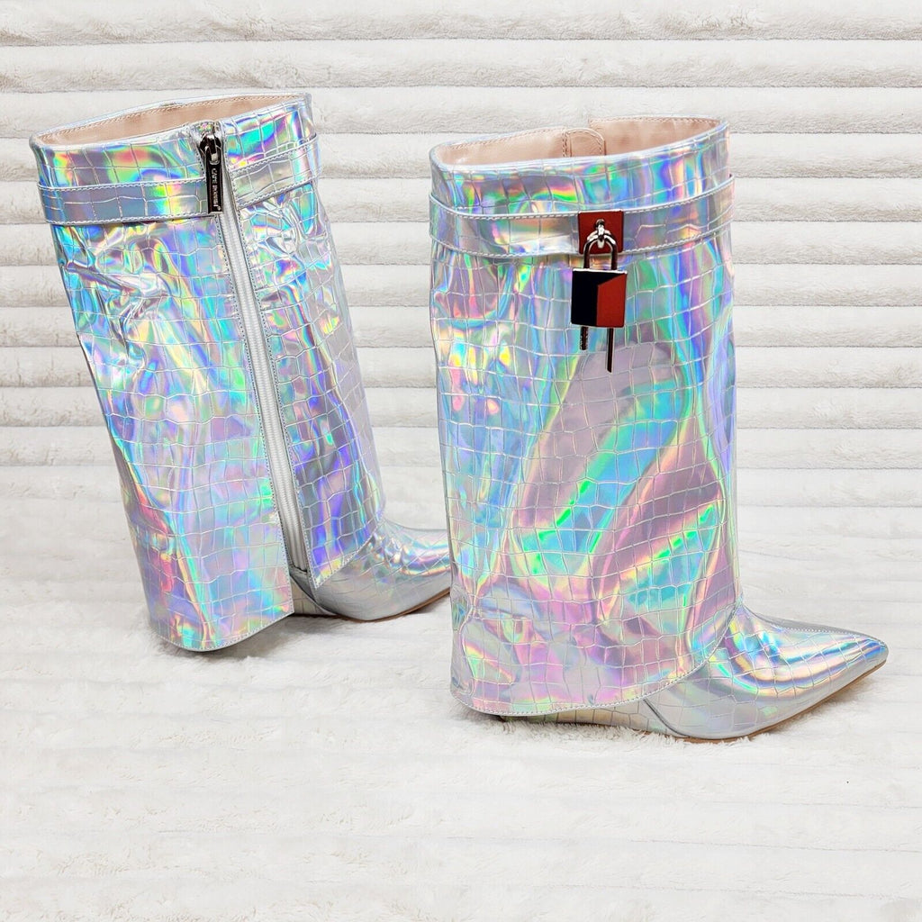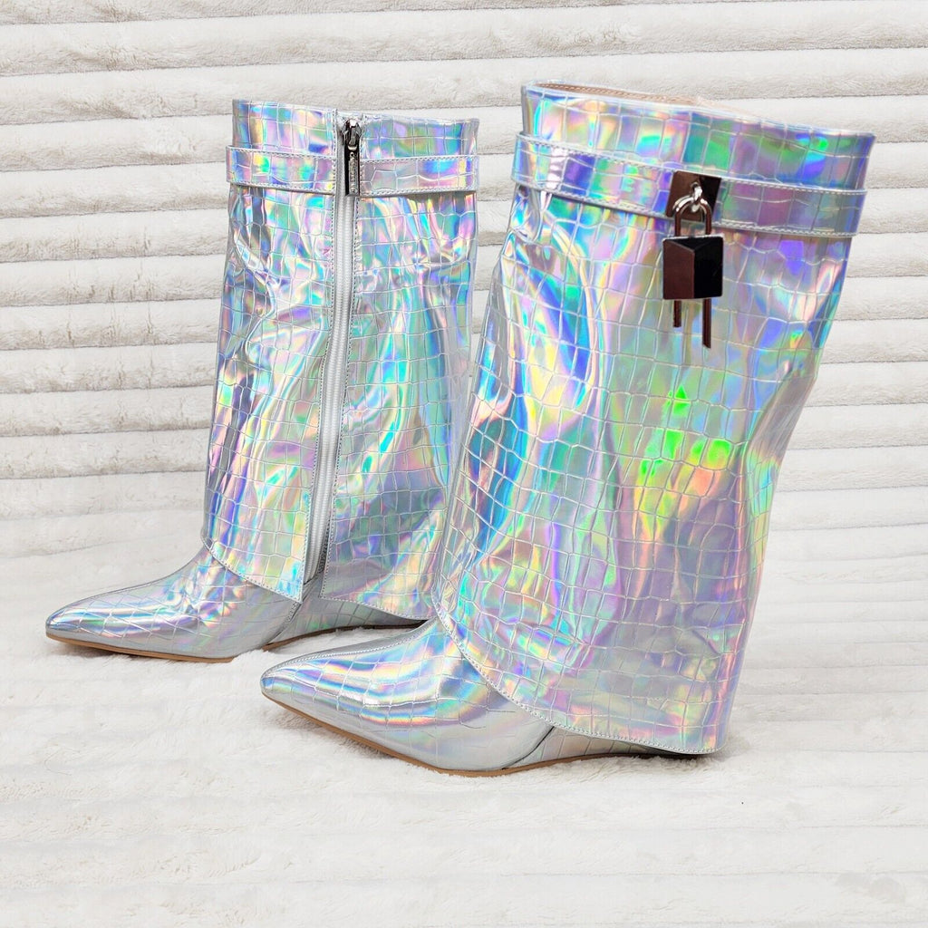 Vision Royal Silver Hologram Wedge Heel Fold Over Skirted Ankle Boots