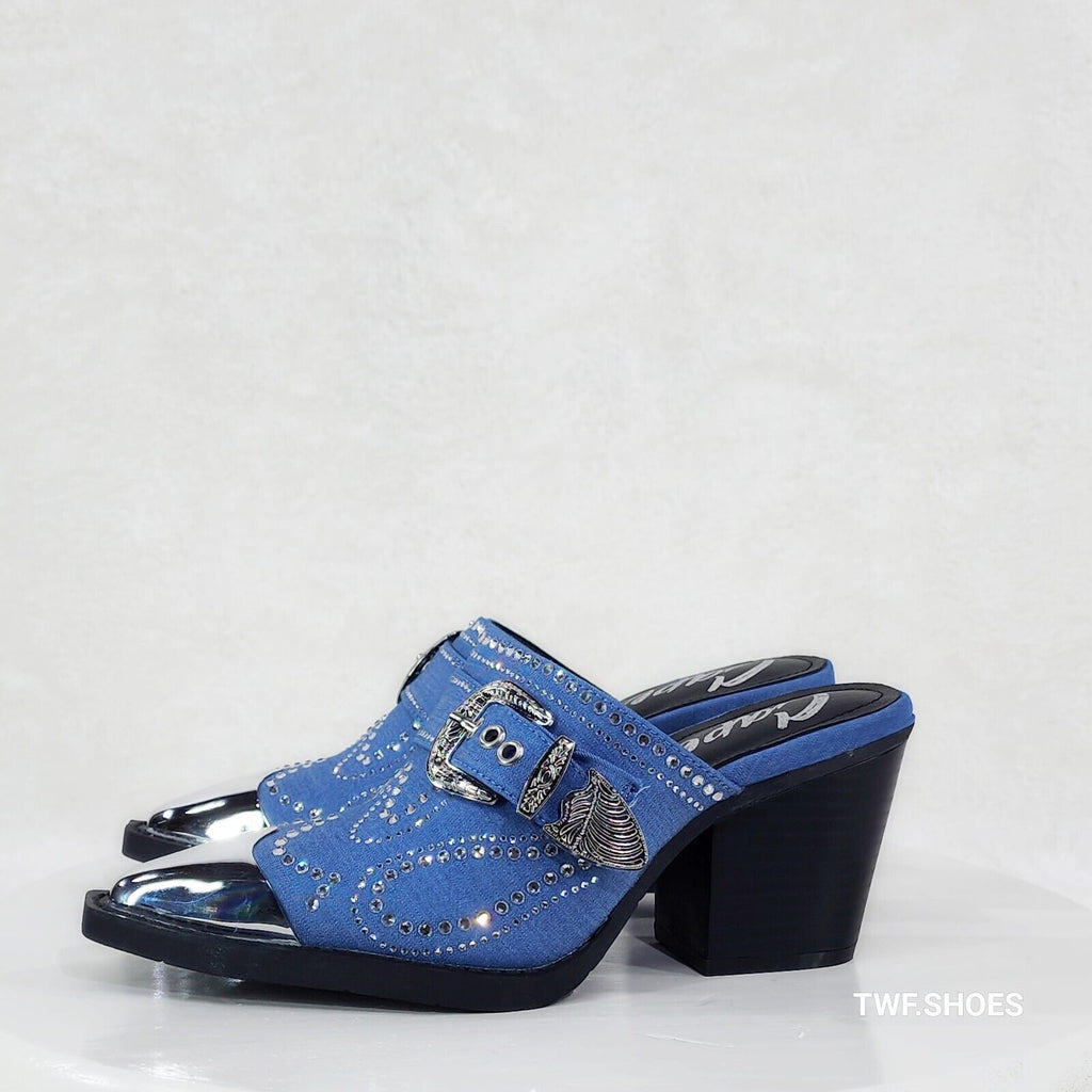 Vive Western Slip On Mules Blue Denim Rhinestones Metal Toe Guard Design