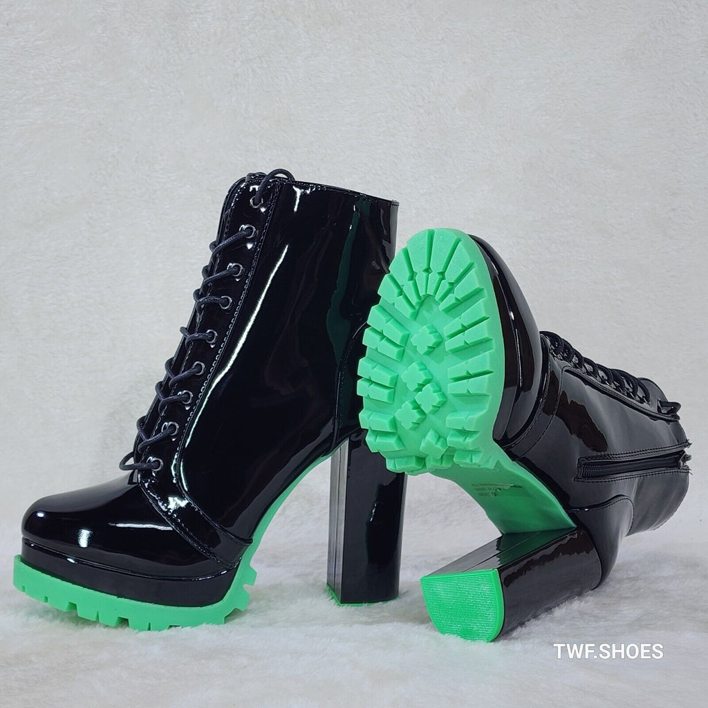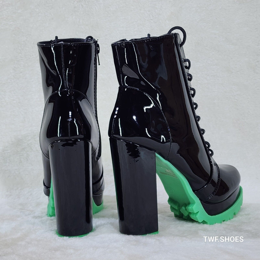 Vivian Black Patent Neon Green Lug Sole Chunky Heel Platform Ankle Boots