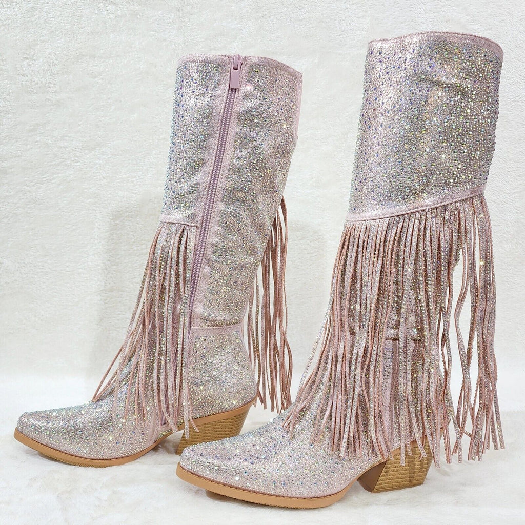 Western Diva Baby Pink Asymmetrical Fringe Rhinestone Glam Cowgirl Boots