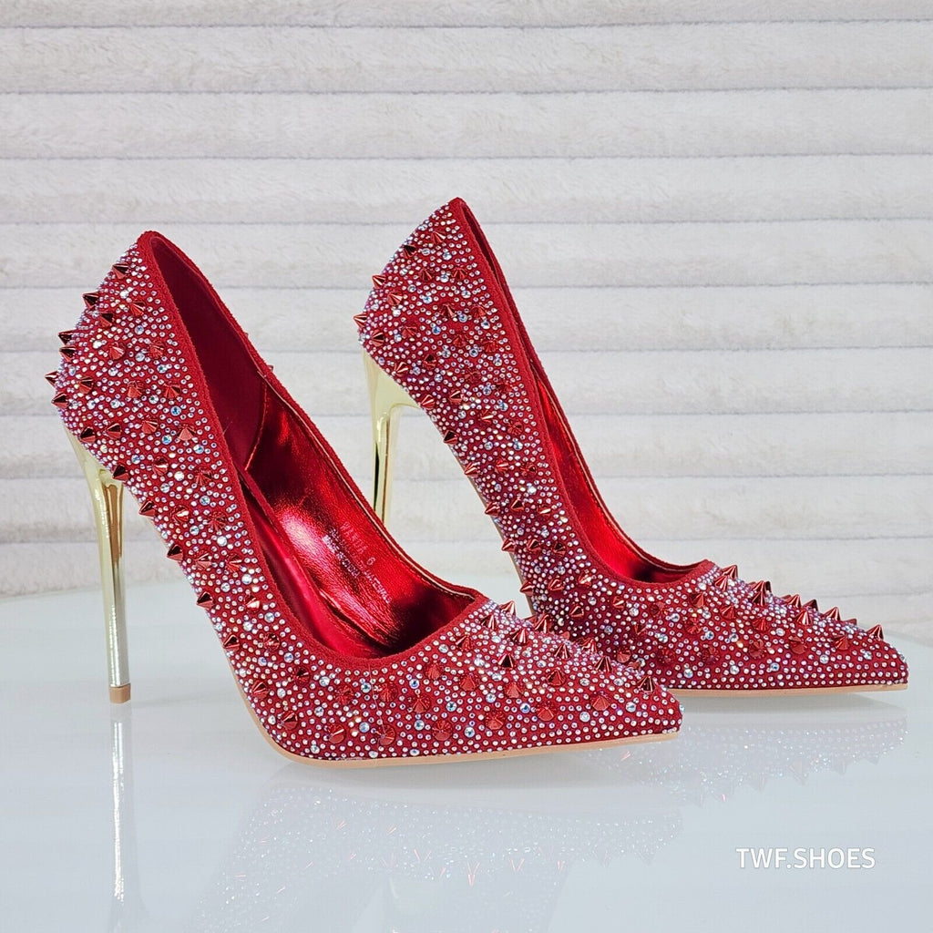 Brand New Metallic Fabric upper Red Spikes and iridescent rhinestones cover the entire upper Metallic Gold Tone 4.5" Stiletto Heels Pointy toe design Cushioned foot-bed Gorgeous design by Berness Shoes Runs TTS More Sizes and colors at - twf.shoes