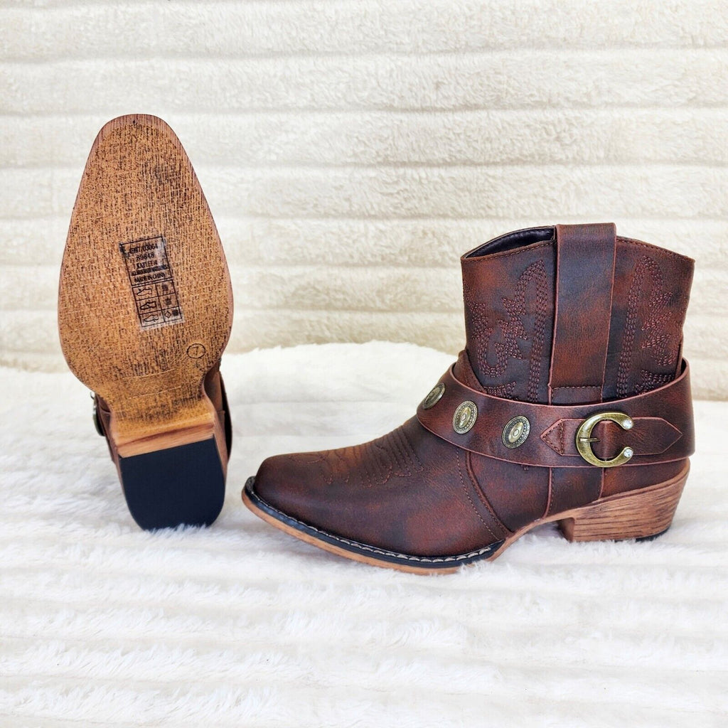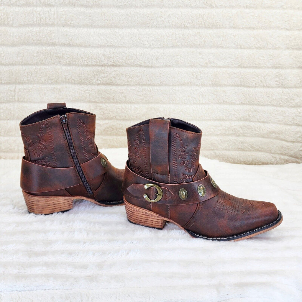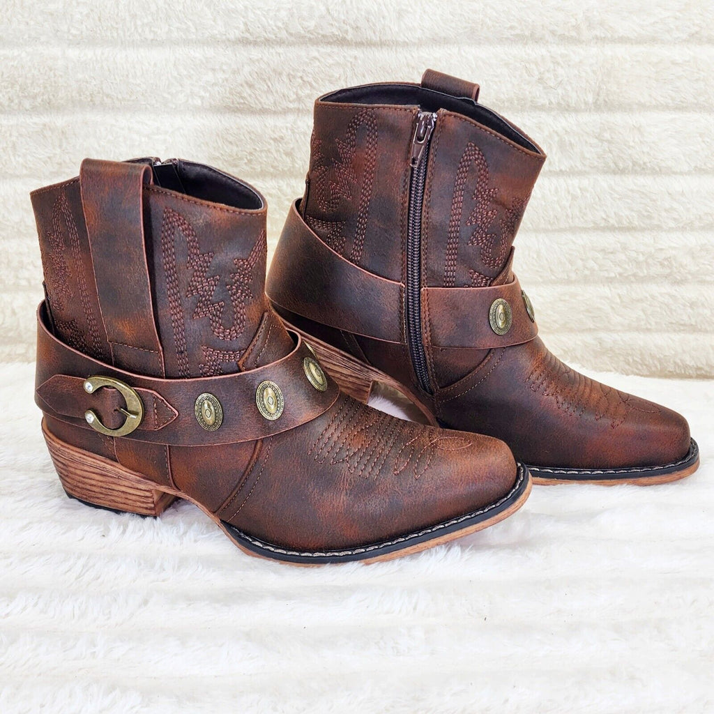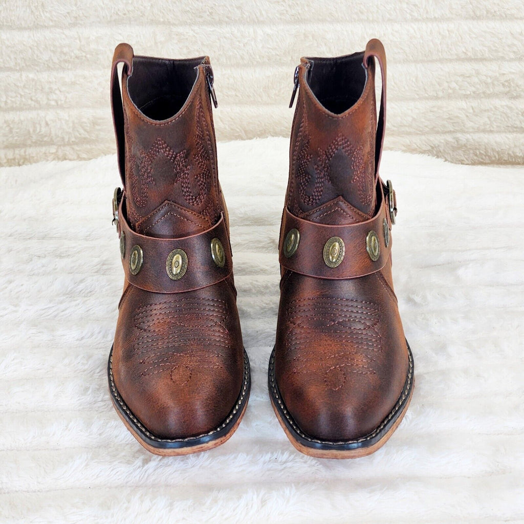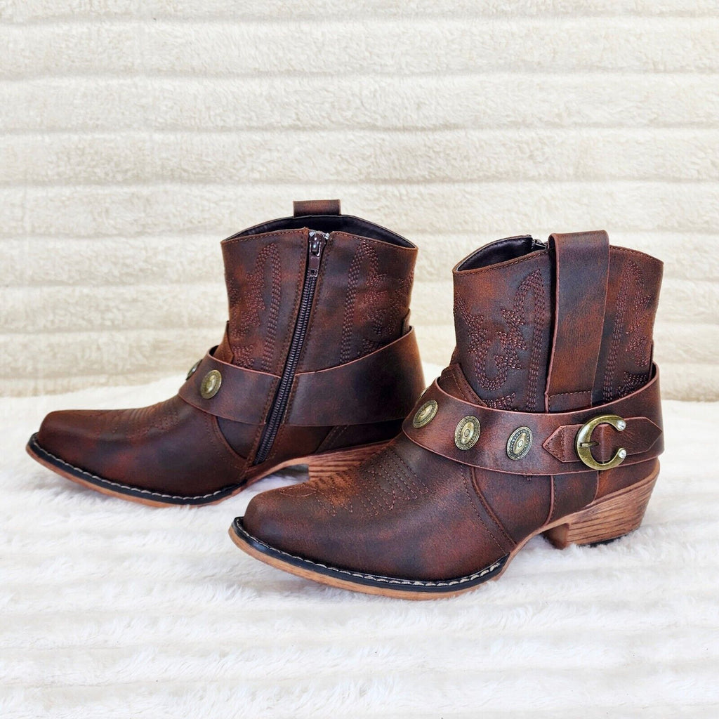 Wild West Brown Distressed Western Cowgirl Pull On Ankle Boots