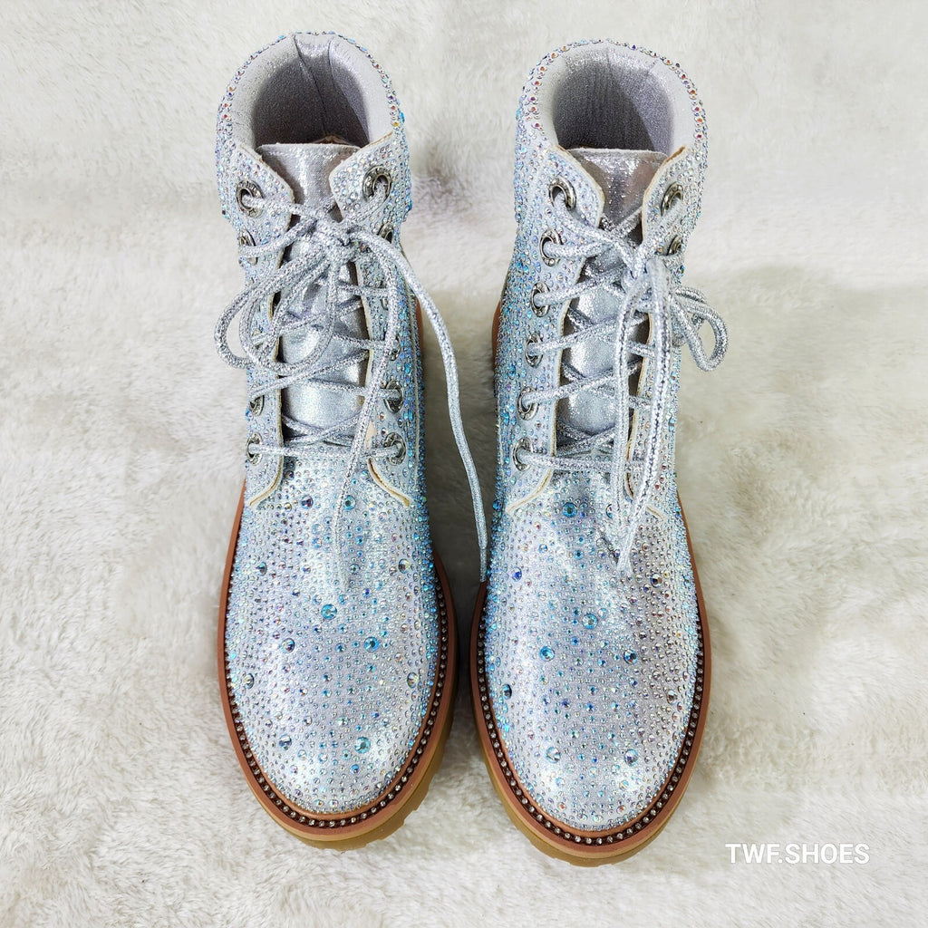 Wonder Sparkling Rhinestone Combat Ankle Boots Metallic Silver Multicolor Stones