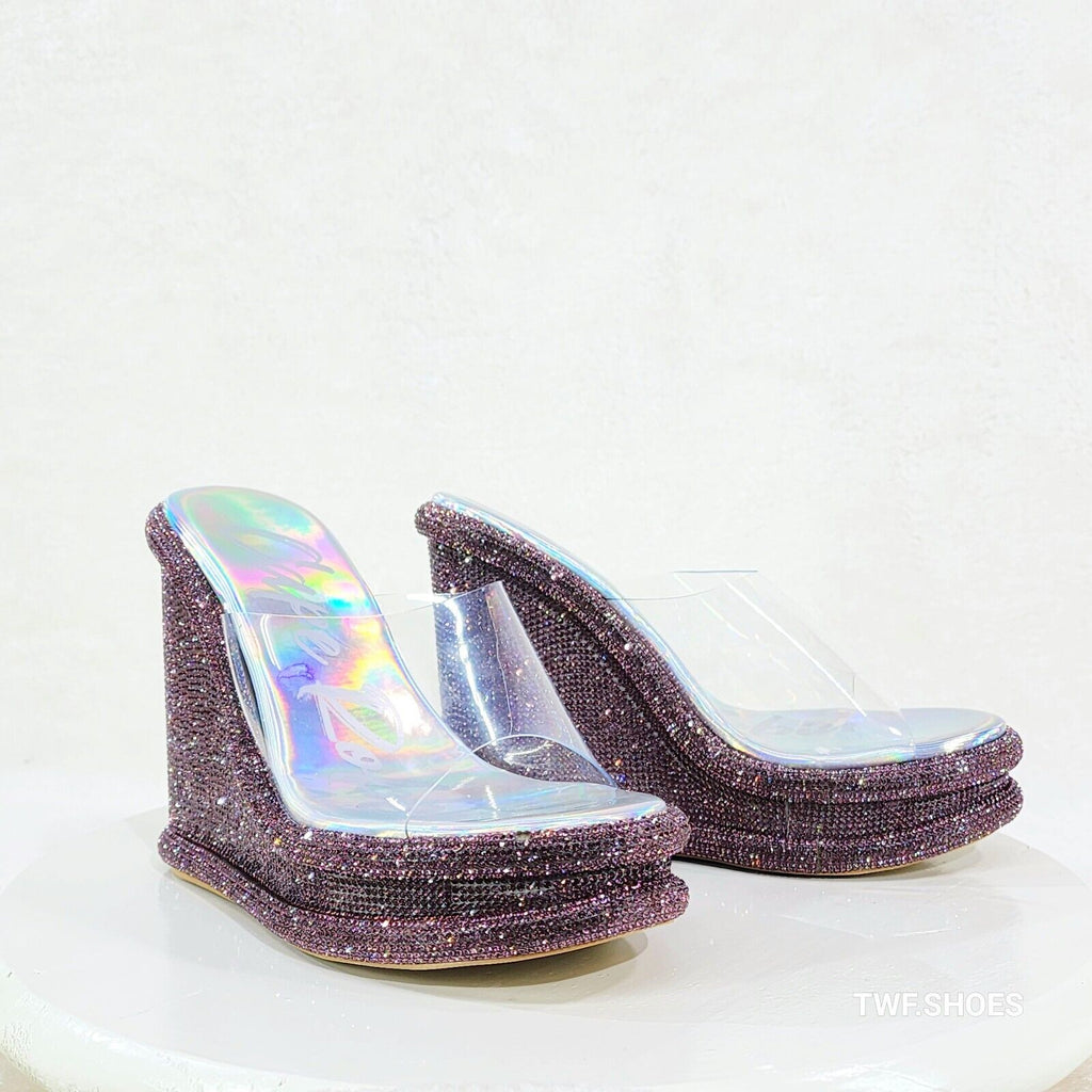 Zesty Purple Hologram Rhinestone Platform Wedge Heel Slip On Sandals
